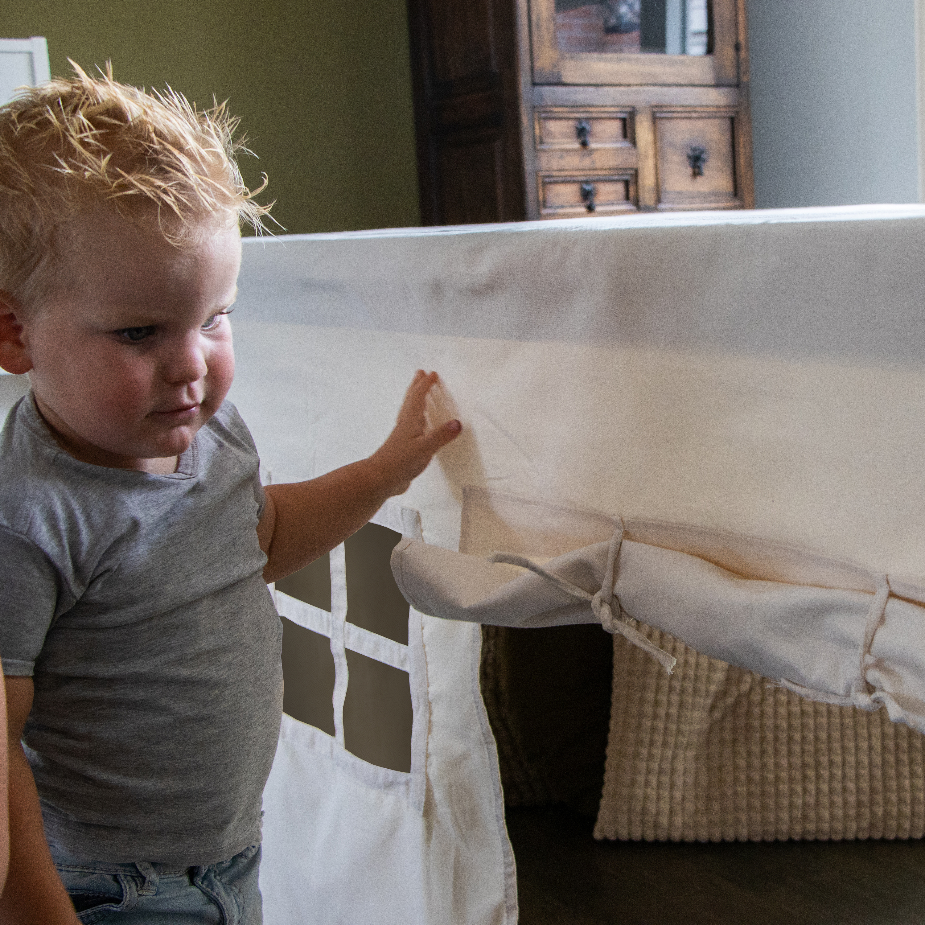 De Sunny Nova tafeltent is voorzien van een handige oprolbare voordeur, die je eenvoudig kunt vastmaken met knooptouwtjes. Dit maakt het in- en uitgaan een feest en geeft kinderen het gevoel van een echte deur. Daarnaast zorgen de drie raampjes ervoor dat je kindje nieuwsgierig naar buiten kan gluren, wat het speelplezier nog groter maakt. De speelse details maken van deze tafeltent een perfecte plek voor fantasierijke avonturen en knusse momenten. De Sunny Nova tafeltent komt het best tot zijn recht op tafels met een minimale afmeting van 160 cm en een maximale afmeting van 200 cm.