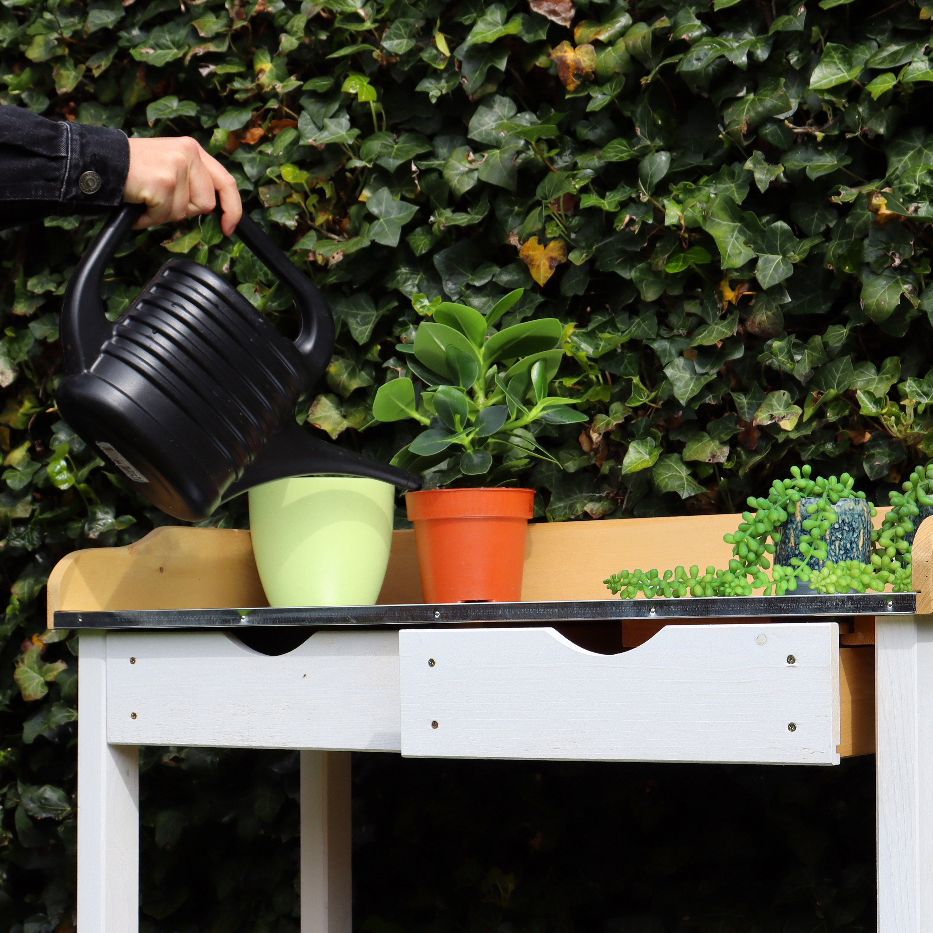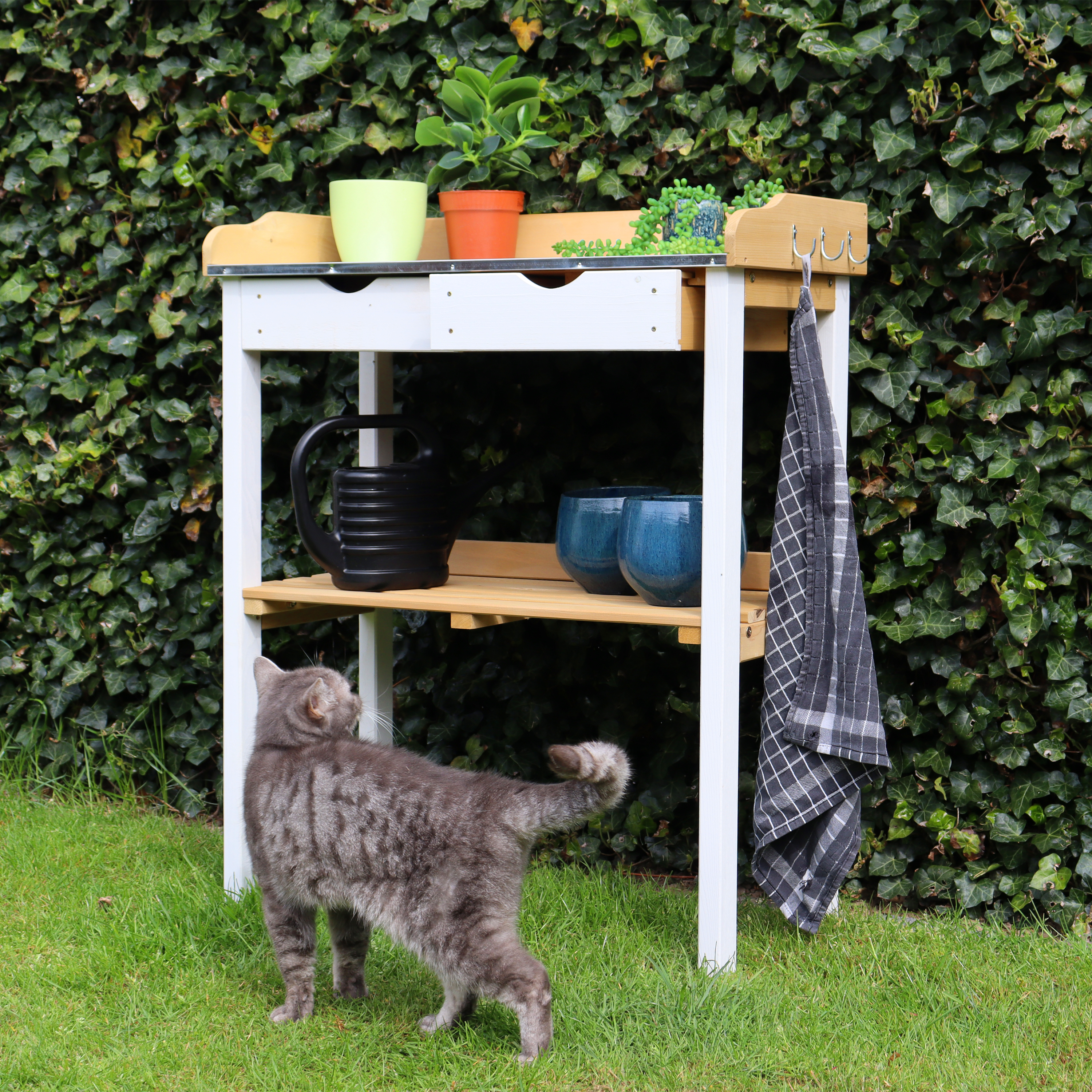De oppottafel heeft een zinken werkblad. Deze is niet alleen eenvoudig te reinigen, maar biedt ook bescherming tegen verwering. De oppottafel heeft veel bergruimte waardoor je jouw tuin of balkon altijd netjes kunt houden. Dankzij het handige formaat past de oppottafel niet alleen perfect in iedere tuin, maar kun je er ook op een klein stadsbalkon perfect mee uit de voeten. Is het tuinseizoen voorbij? Dan kun je de kweektafel ook als een leuke en decoratieve sidetable gebruiken. Stal bijvoorbeeld een mooie gieter of een andere outdoor eyecatcher uit! Door het gebruik van frisse en natuurlijke houten kleuren komt de tafel in iedere tuin perfect tot zijn recht.