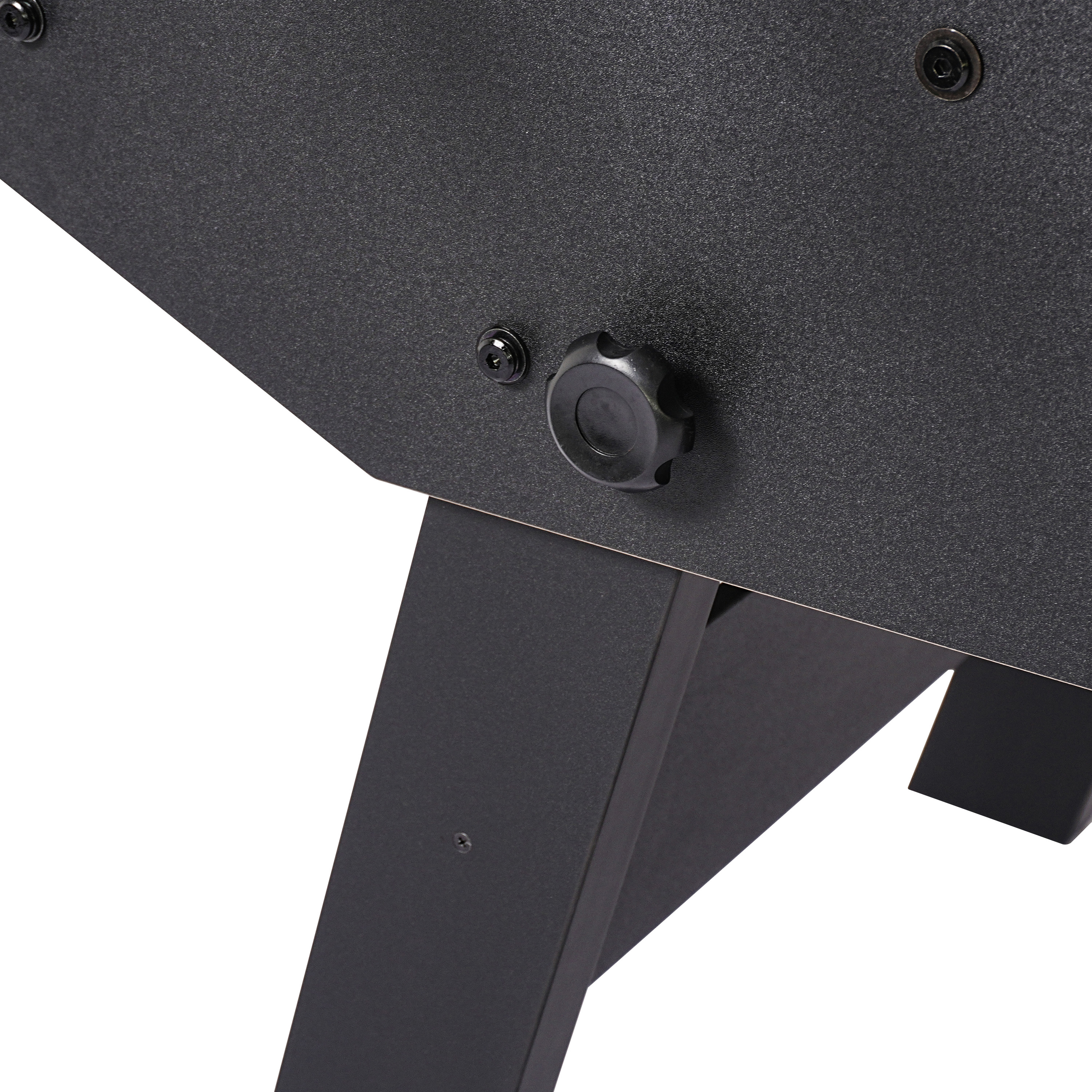 Deze tafelvoetbaltafel heeft een speeloppervlak van 116,6 x 68 cm en is uitgerust met verhoogde hoeken, zodat de bal nooit stil komt te liggen. De stangen zijn gemaakt van staal met een chroomlaag, waardoor je altijd soepel kunt spelen. Daarnaast hebben de stangen een diameter van 2,2 cm en zijn daarmee dikker en steviger dan de standaard 1,5 cm stangen – ideaal voor fanatieke potjes tafelvoetbal. Dankzij de TPR-handgrepen heb je extra grip én comfort tijdens het spelen. De meegeleverde bumpers houden de afstand tussen de poppen en de zijkant netjes in balans.
