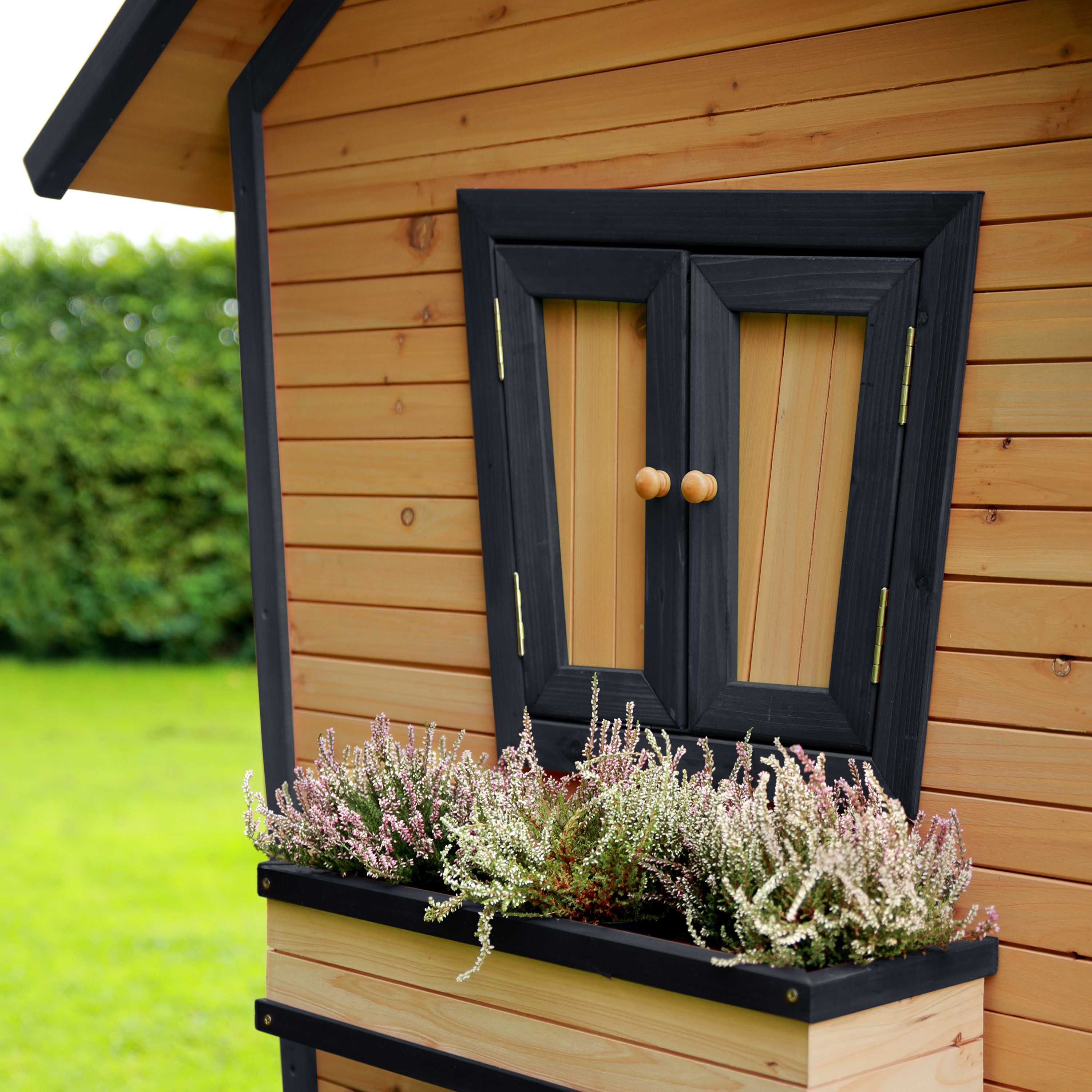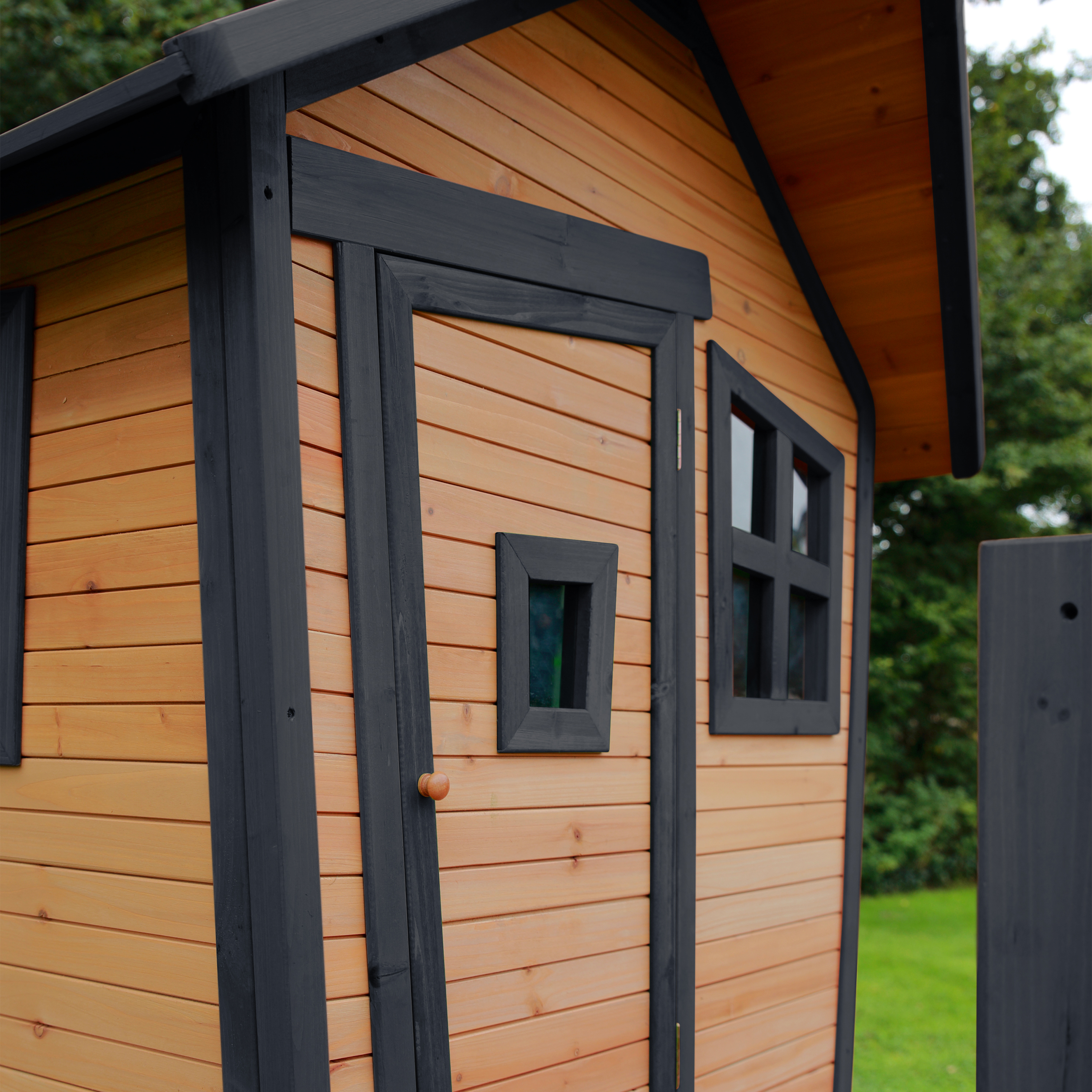 Kinderen vinden het heerlijk om met vriendjes of vriendinnetjes in het houten Robin Speelhuis Bruin/antraciet van AXI te spelen. Klimmen op de trap, over de veranda en snel weer naar beneden van de glijbaan. Hoe vaker ze naar beneden glijden, hoe leuker ze het vinden! In dit speelhuis kunnen ze elkaar de mooiste geheimen vertellen. Zodra ze de ramen en deur dicht doen, kan niemand ze meer afluisteren! Robin is een veelzijdig houten speelhuis uit de unieke Crooked serie van AXI. Het speelhuisje is uitgevoerd in moderne Bruin/antraciete kleuren welke perfect in iedere hedendaagse tuin passen. Alle speelhuisjes van het Crooked ontwerp hebben een schoorsteen op het dak en schuine ramen. De schuine deur heeft een klein raampje zodat kinderen kunnen zien wie er voor de deur staat zonder deze te openen. Robin speelhuis heeft een platformhoogte van 58 cm en is uitgevoerd met een kleine glijbaan van 118 cm lang.