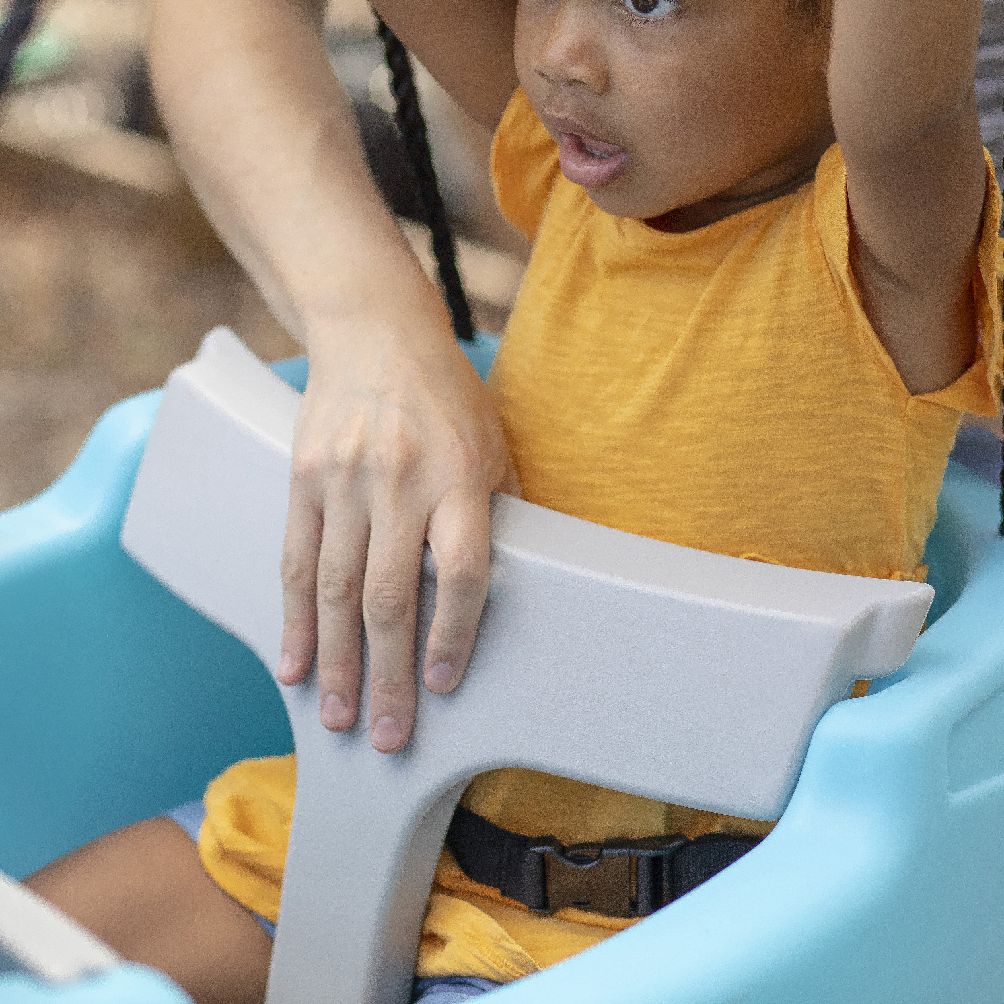 - Verstelbare heupgordels zorgen voor een veilige rit voor baby's en peuters. De t-stang biedt extra veiligheid voor kinderen die zich tijdens de rit willen vasthouden.