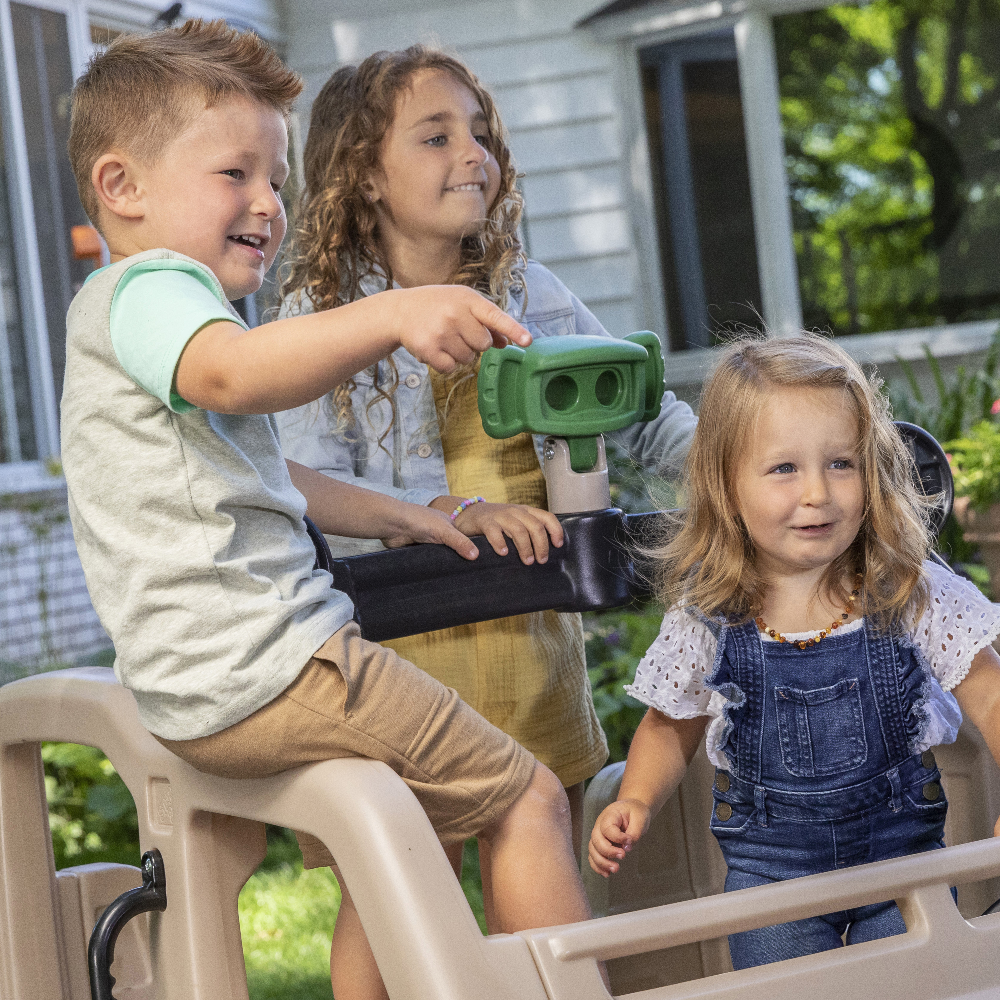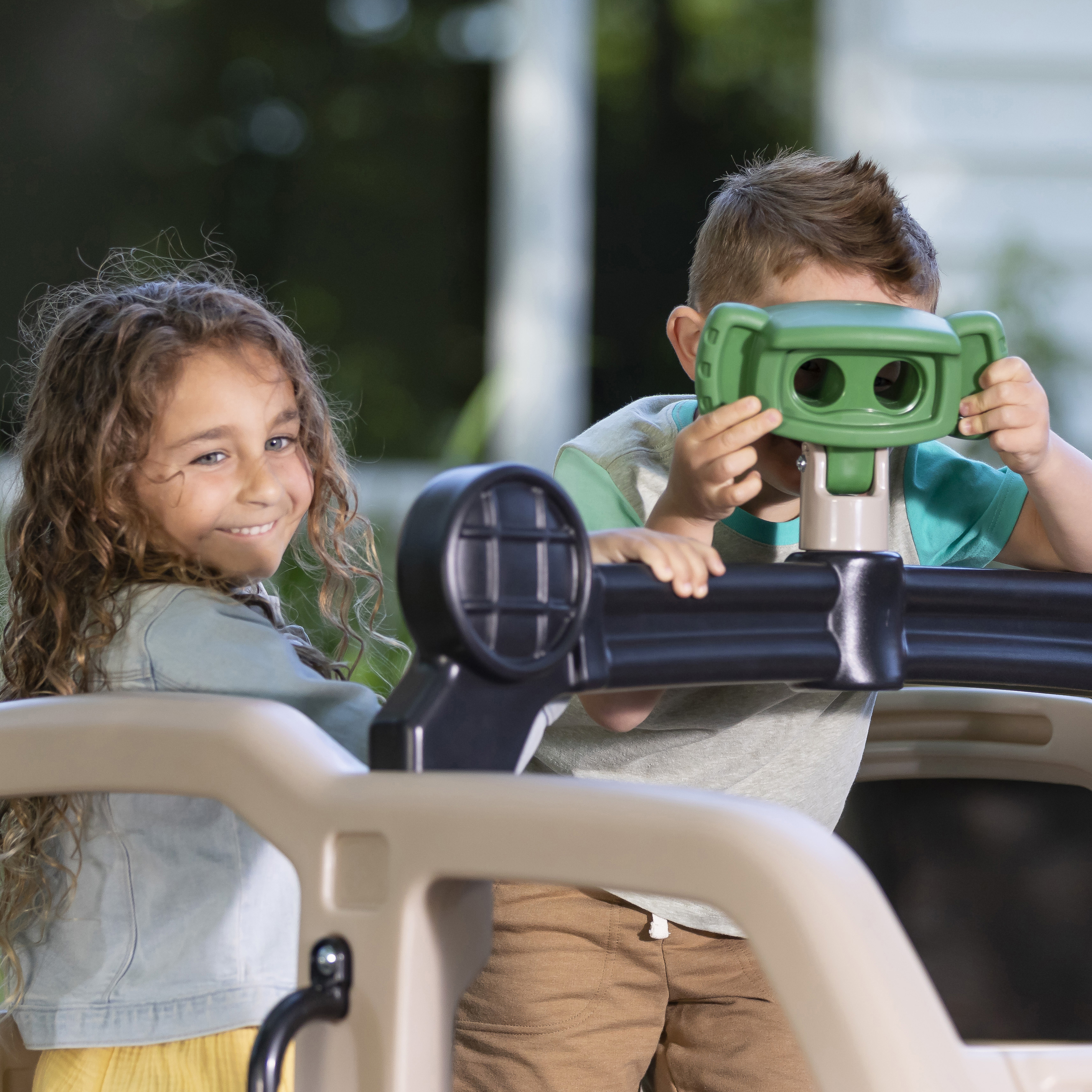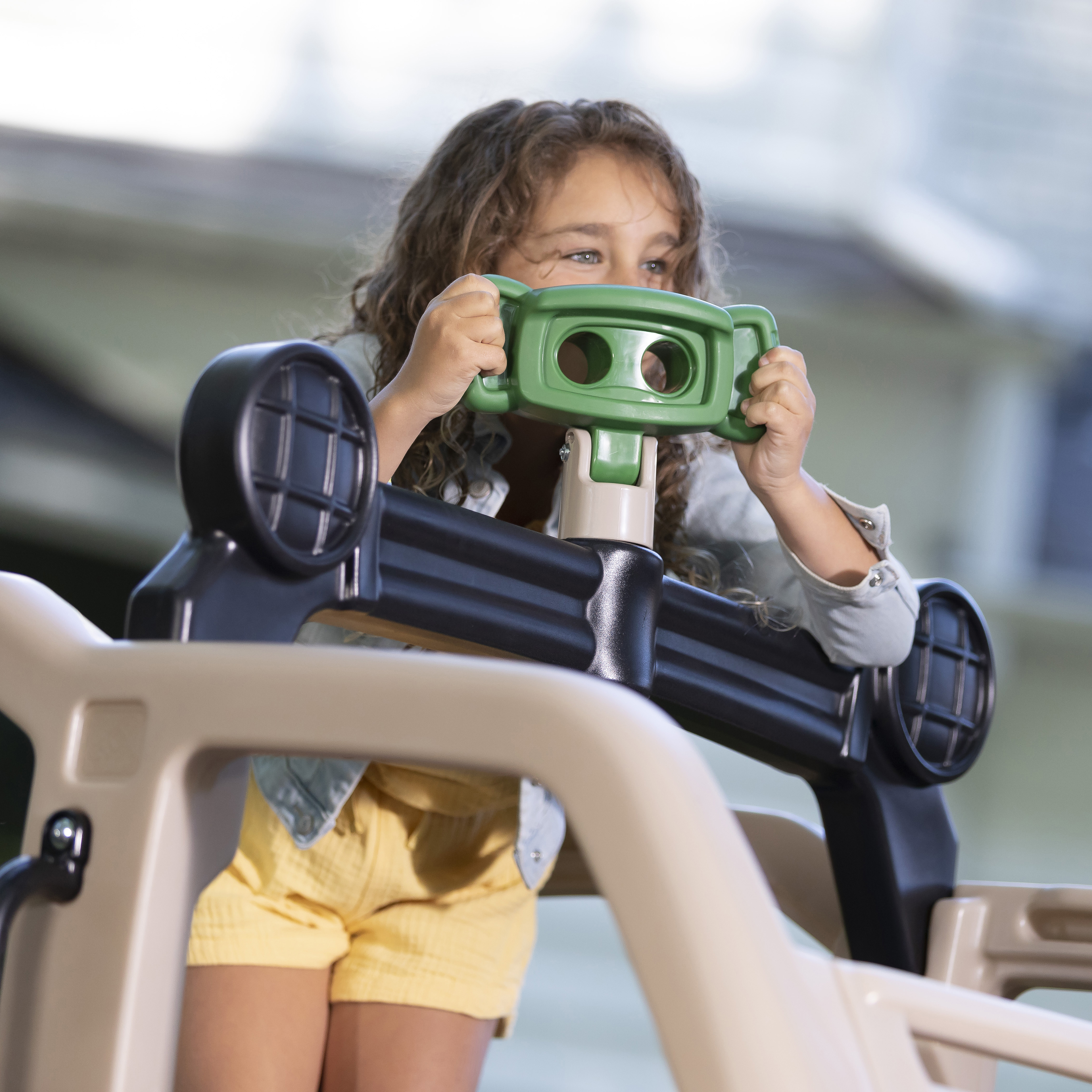 Verander je achtertuin in een wild avontuur met de Step2 Safari Truck Climber! Dit stoere klimtoestel in de form van een terreinwagen heeft een realistisch off-road ontwerp, met oversized wielen, een neutraal, safari kleurenpalet, een open dakdesign en een stoere grille met koplampstickers. Hij heeft zelfs een verrekijker waarmee je wilde dieren kunt spotten! Kleine avonturiers kunnen door de oversized wielen kruipen of deze als trap gebruiken om naar het bovenste platform te klimmen. Wanneer ze in de terreinwagen zitten, kunnen kinderen om de beurt aan het stuur zitten en door de verrekijker kijken. Als je kleintjes er klaar voor zijn om wilde dieren van dichtbij te zien, kunnen ze van de glijbaan glijden en vrij tussen de dieren rondlopen!