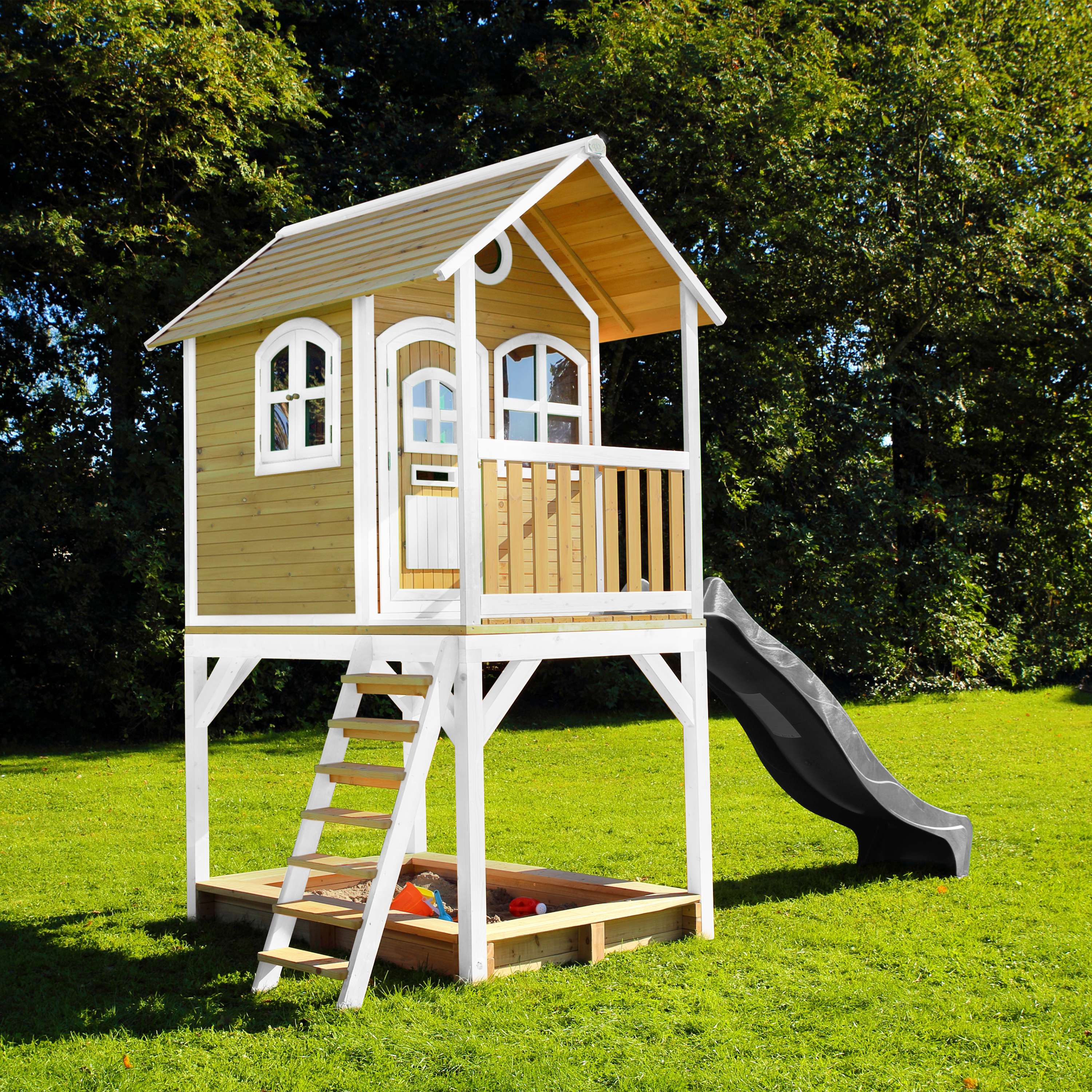 Sarah Speelhuis Bruin/wit van AXI heeft echt alles wat je kinderen maar wensen kunnen! Een trap om in het huisje te klimmen en vervolgens van de lange glijbaan naar beneden te roetsjen. En dan zijn ze nog niet uitgespeeld, want onder het speelhuis is ook nog een zandbak waar ze met z'n allen zandtaartjes kunt bakken. In dit speelhuis kunnen ze elkaar de mooiste geheimen vertellen. Zodra ze de ramen en deur dicht doen, kan niemand ze meer afluisteren! Sarah is een veelzijdig houten speelhuis met een halfronde deur en ramen. De deur heeft een brievenbus waar kinderen post doorheen kunnen gooien als ze postbodetje spelen. Het speelhuisje is uitgevoerd in moderne bruin/witte kleuren welke perfect in iedere hedendaagse tuin passen. Sarah speelhuis heeft een platformhoogte van 118 cm en is uitgevoerd met een grote glijbaan van 228 cm lang. Het trapje en glijbaan kunnen zowel links als rechts aan het speelhuis worden bevestigd. Als de kinderen zijn uitgespeeld kan de zandbak eenvoudig worden afgedekt met de meegeleverde afdekhoes.