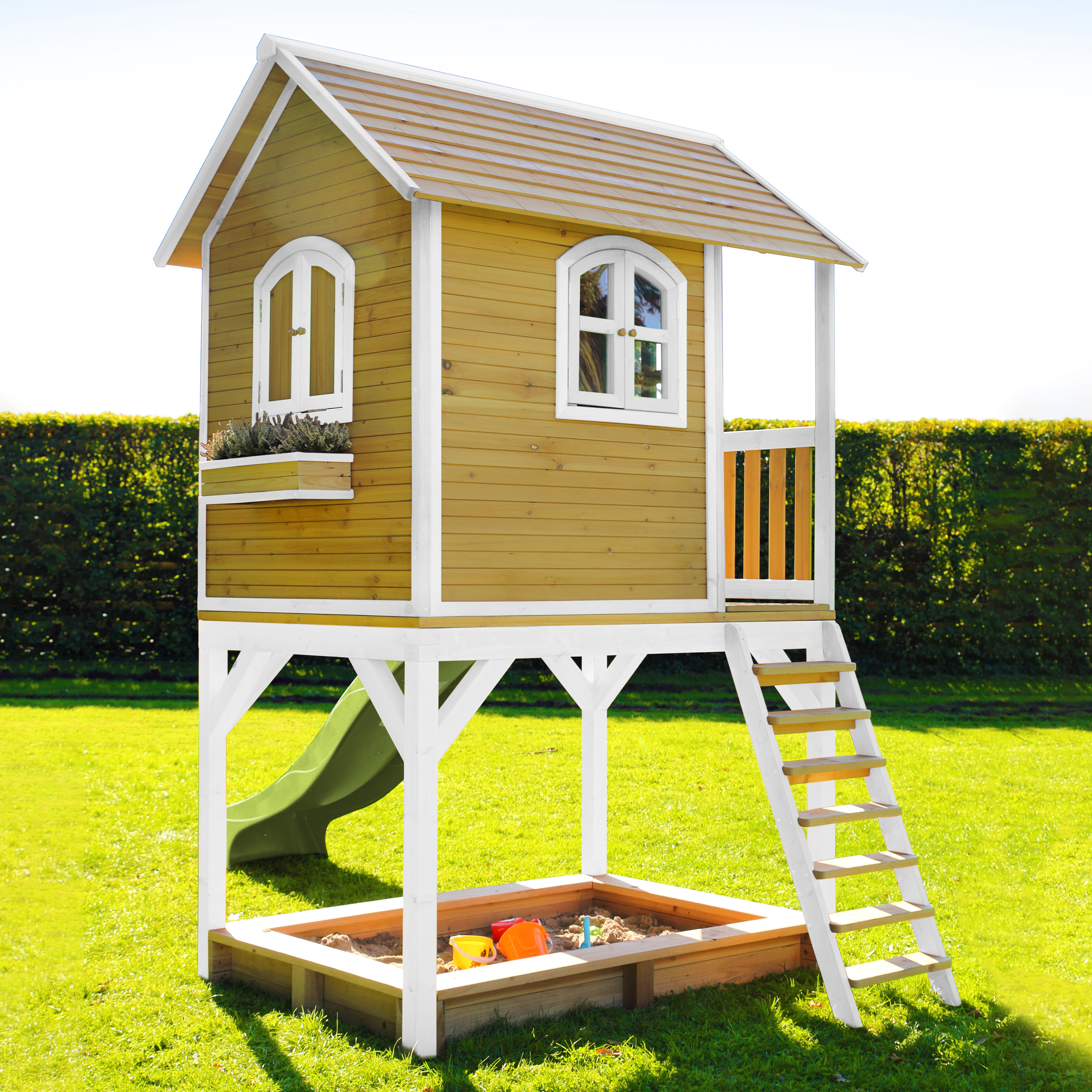 Sarah Speelhuis Bruin/wit van AXI heeft echt alles wat je kinderen maar wensen kunnen! Een trap om in het huisje te klimmen en vervolgens van de lange glijbaan naar beneden te roetsjen. En dan zijn ze nog niet uitgespeeld, want onder het speelhuis is ook nog een zandbak waar ze met z'n allen zandtaartjes kunt bakken. In dit speelhuis kunnen ze elkaar de mooiste geheimen vertellen. Zodra ze de ramen en deur dicht doen, kan niemand ze meer afluisteren! Sarah is een veelzijdig houten speelhuis met een halfronde deur en ramen. De deur heeft een brievenbus waar kinderen post doorheen kunnen gooien als ze postbodetje spelen. Het speelhuisje is uitgevoerd in moderne bruin/witte kleuren welke perfect in iedere hedendaagse tuin passen. Sarah speelhuis heeft een platformhoogte van 118 cm en is uitgevoerd met een grote glijbaan van 228 cm lang. Het trapje en glijbaan kunnen zowel links als rechts aan het speelhuis worden bevestigd. Als de kinderen zijn uitgespeeld kan de zandbak eenvoudig worden afgedekt met de meegeleverde afdekhoes.