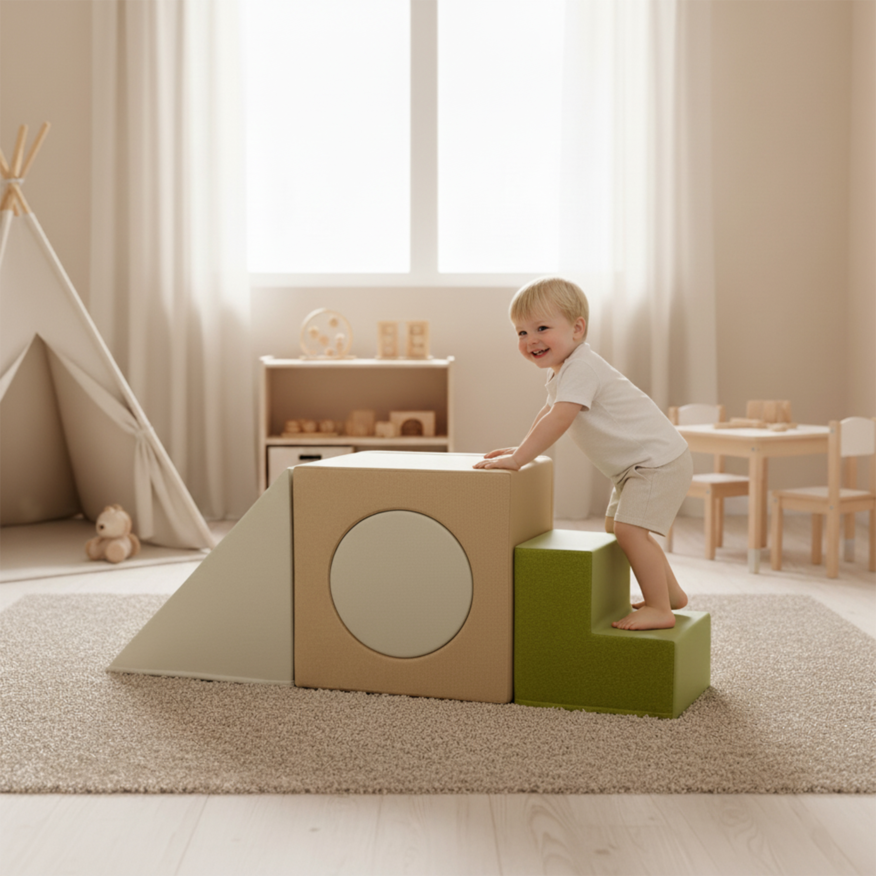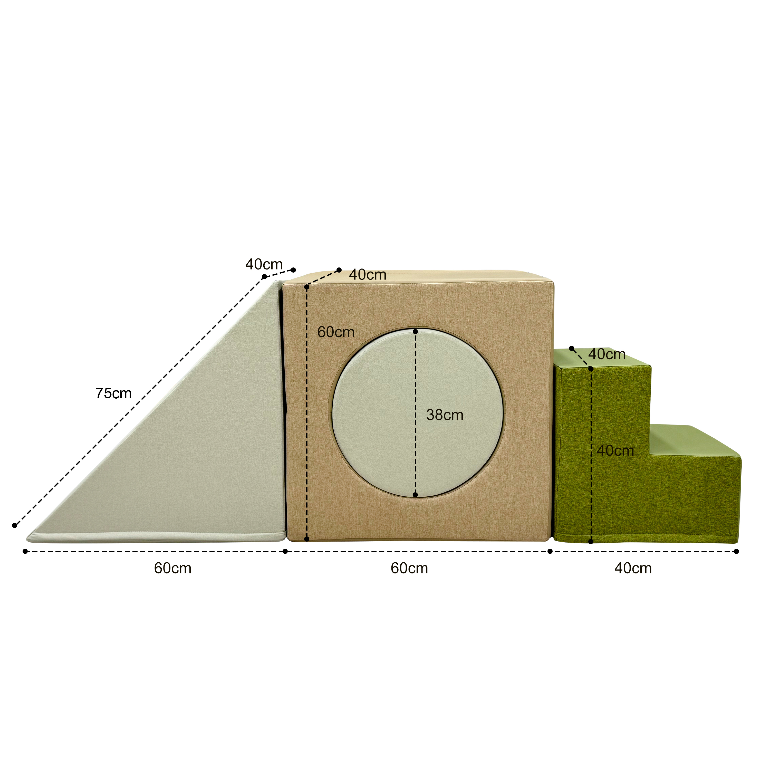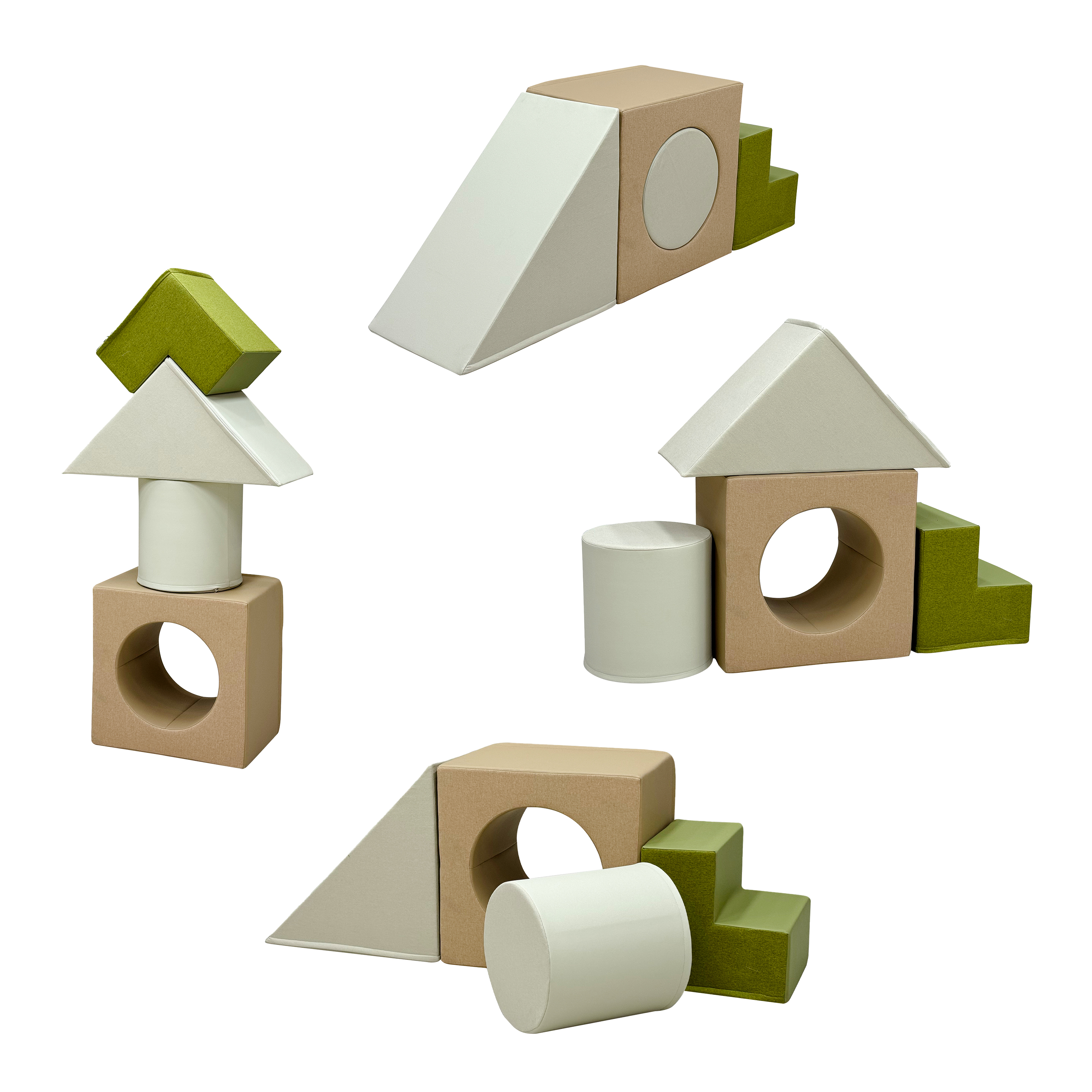 - 4-delige set van foam speelblokken in rustige natuurtinten (trap, schuine helling, tunnelblok en cilinder).