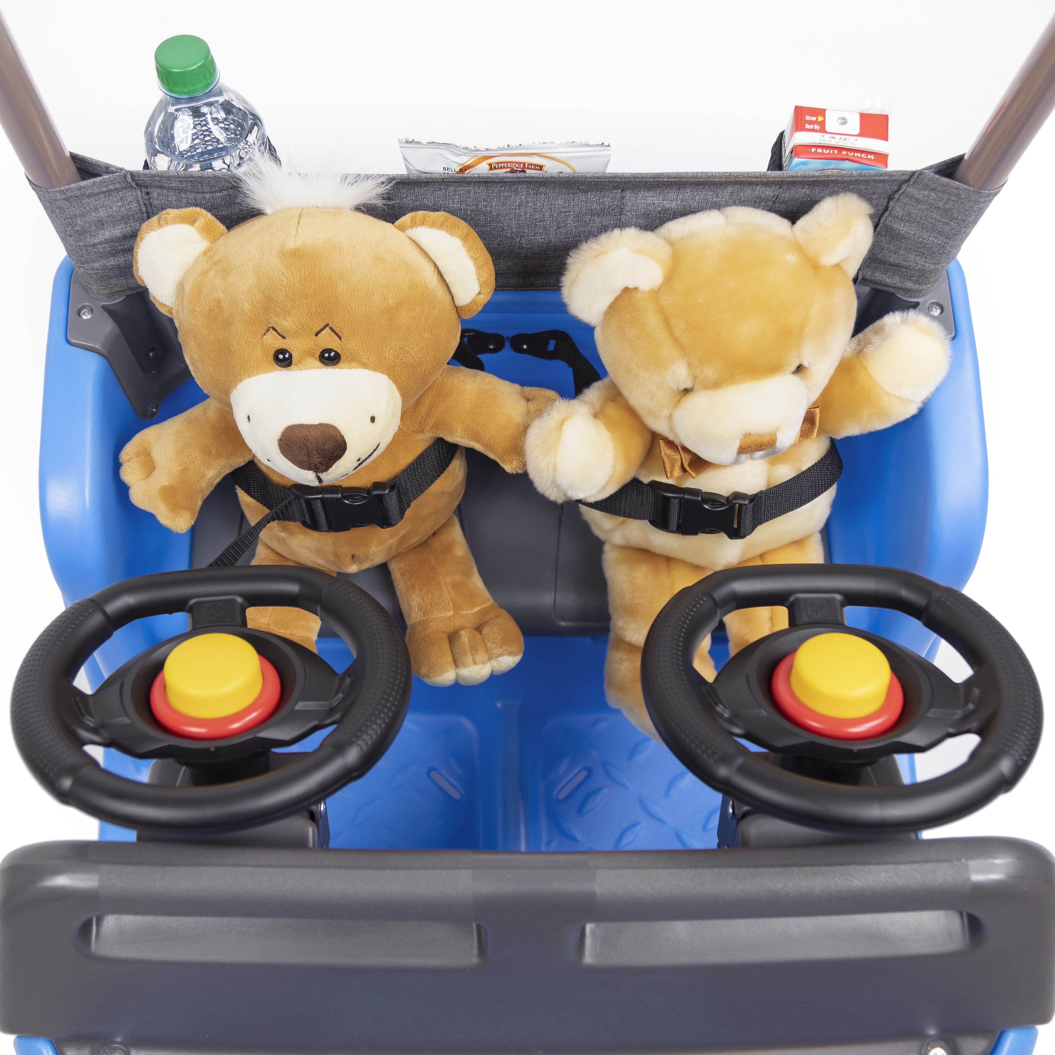 - Elke peuter heeft zijn eigen veiligheidsgordel en stuurwiel.