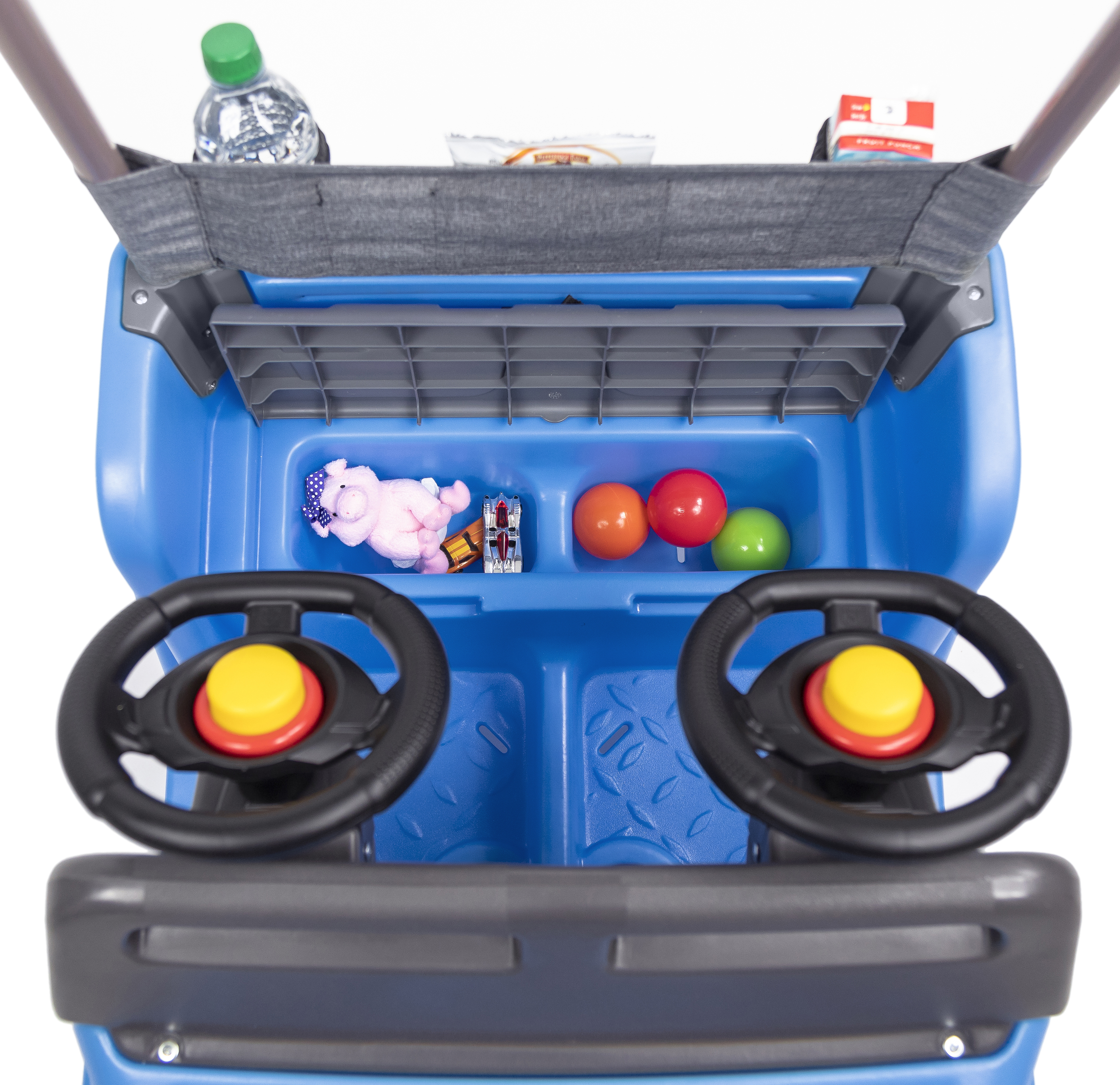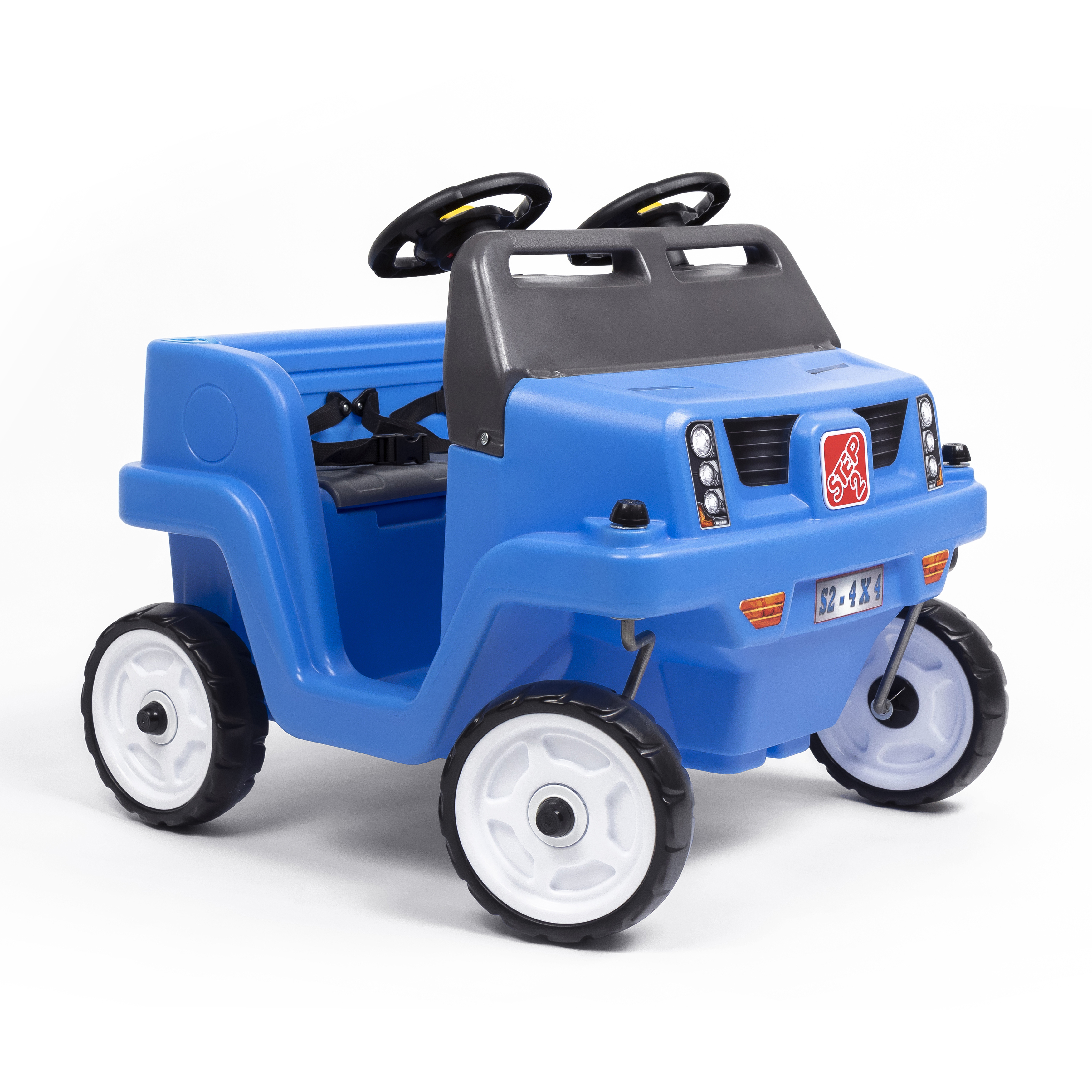 Breng het plezier van het buitenspelen naar een hoger niveau met het zij-aan-zij-ontwerp van deze tweezitter! Twee peuters kunnen comfortabel rijden in de gloednieuwe Side-By-Side Push Around SUV™ van Step2, elk met voorgevormde zittingen en veel beenruimte. Van de realistische off-road SUV-styling tot de grote wielen met draaibare besturing en extra opbergmogelijkheden onder de zitbank, deze tweezitter heeft zo veel functies die spanning toevoegen aan elk avontuur. Maak de riemen vast met de twee veiligheidsgordels en vouw de verstelbare kap naar beneden om deze op zijn plaats te houden voor een schaduwrijke rit. De kleintjes kunnen zelfs doen alsof ze met hun off-road terreinwagen rijden, elk met een eigen stuurwiel! Er is zelfs extra opbergruimte voor de ouders; berg de essentiële spullen voor de uitstapjes op in de gaaszakken achterop de basis van de luifel. Klaar om te rijden? Met deze tweepersoons duw auto is het een koud kunstje om in de buurt en daarbuiten te wandelen!