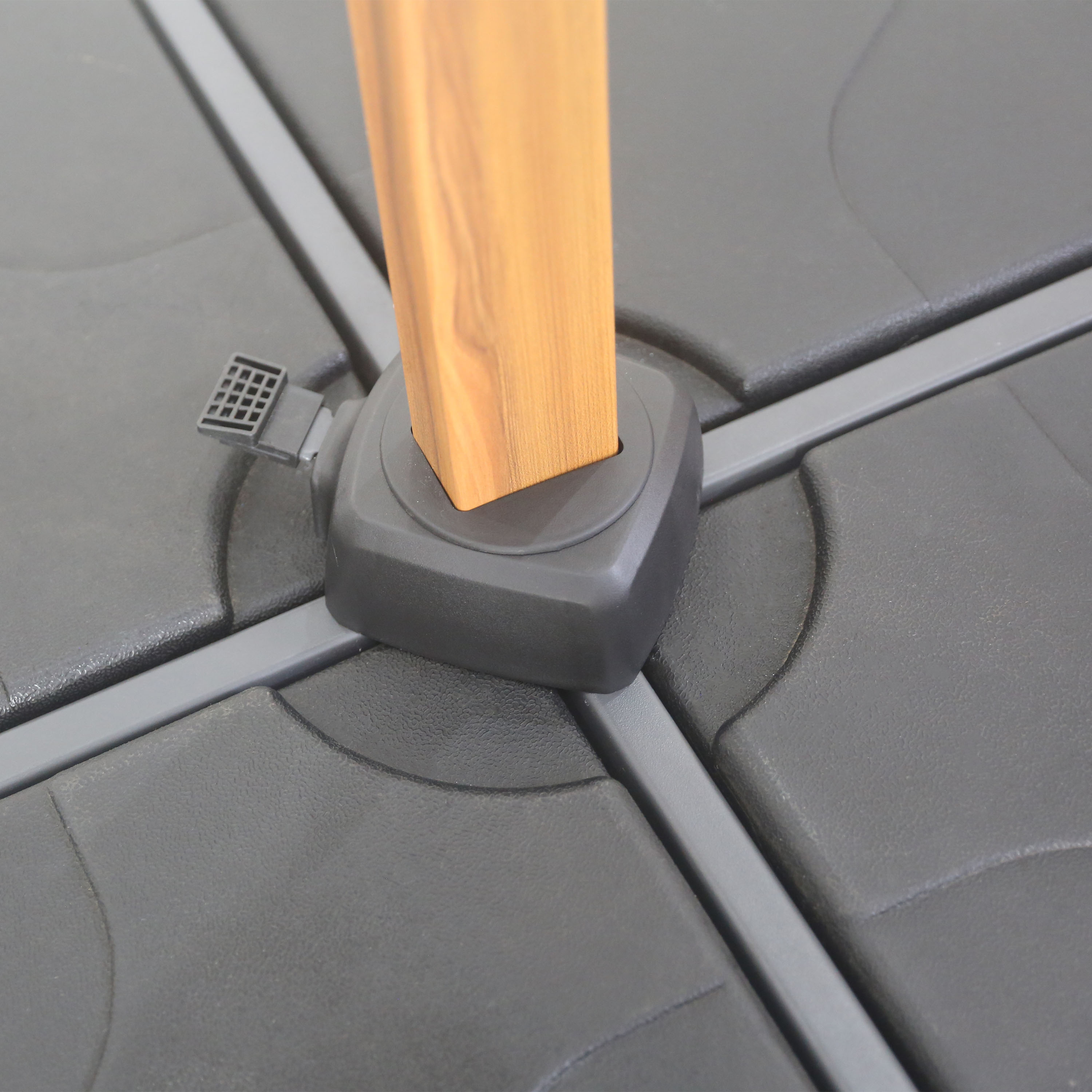 De parasol wordt geleverd met een kruisvoet, die je eenvoudig kunt verzwaren met tegels van in totaal minimaal 90 kg voor optimale stabiliteit. Daarnaast ontvang je een beschermhoes, zodat je de parasol netjes kunt afdekken wanneer deze niet in gebruik is. Dit helpt om de levensduur te verlengen en de parasol langer mooi te houden.