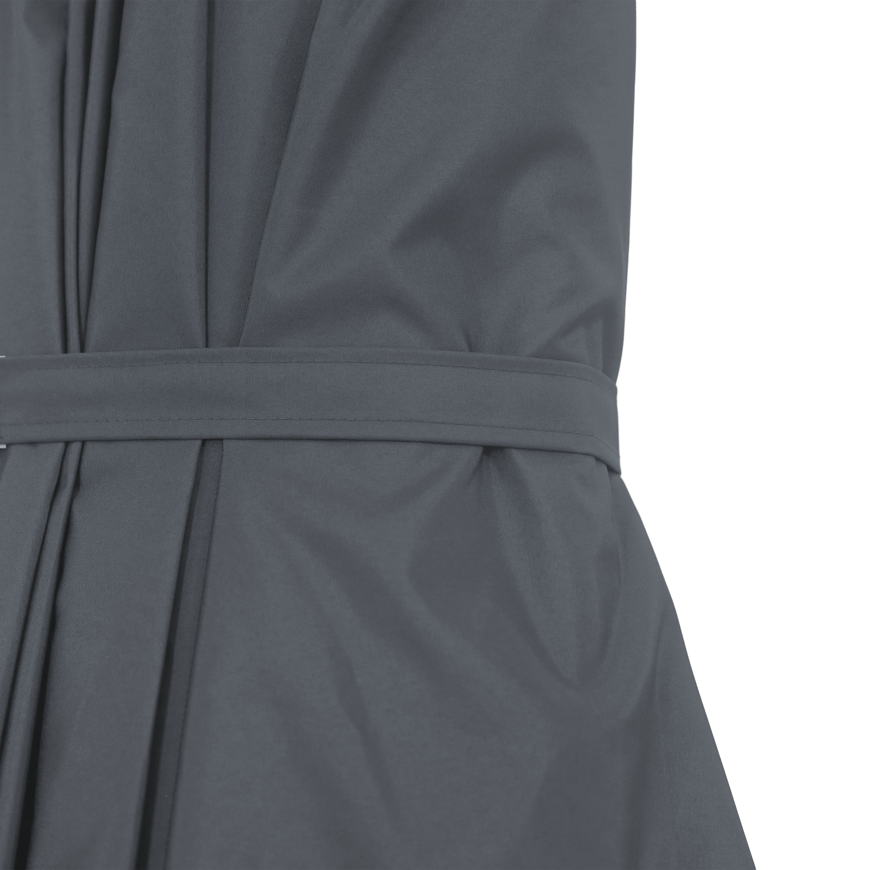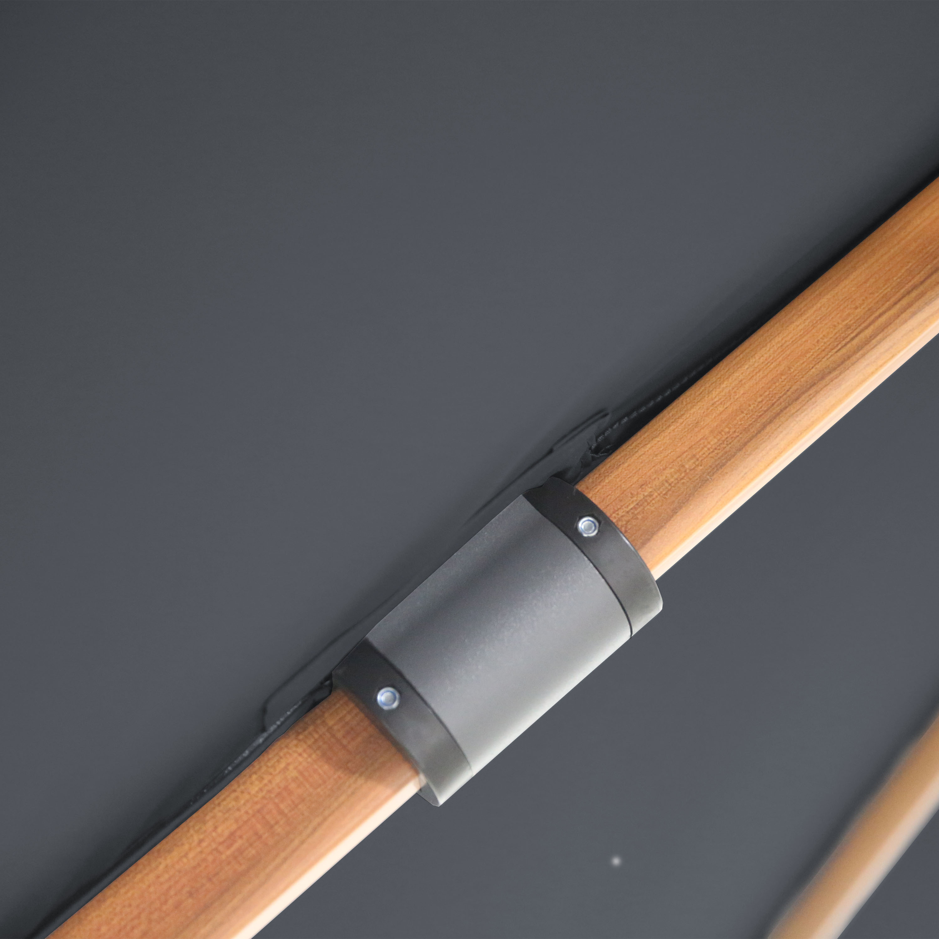 De Solis zweefparasol is ontworpen met oog voor stabiliteit. Het frame van gepoedercoat staal en aluminium is extra robuust dankzij het dikke profiel van 53 x 80 mm. De 8 baleinen zorgen voor een gelijkmatige verdeling van het doek, terwijl de geïntegreerde doekspanners het doek strak gespannen houden. Dit voorkomt klapperen bij wind en zorgt voor een nette, verzorgde uitstraling – zelfs na intensief gebruik.