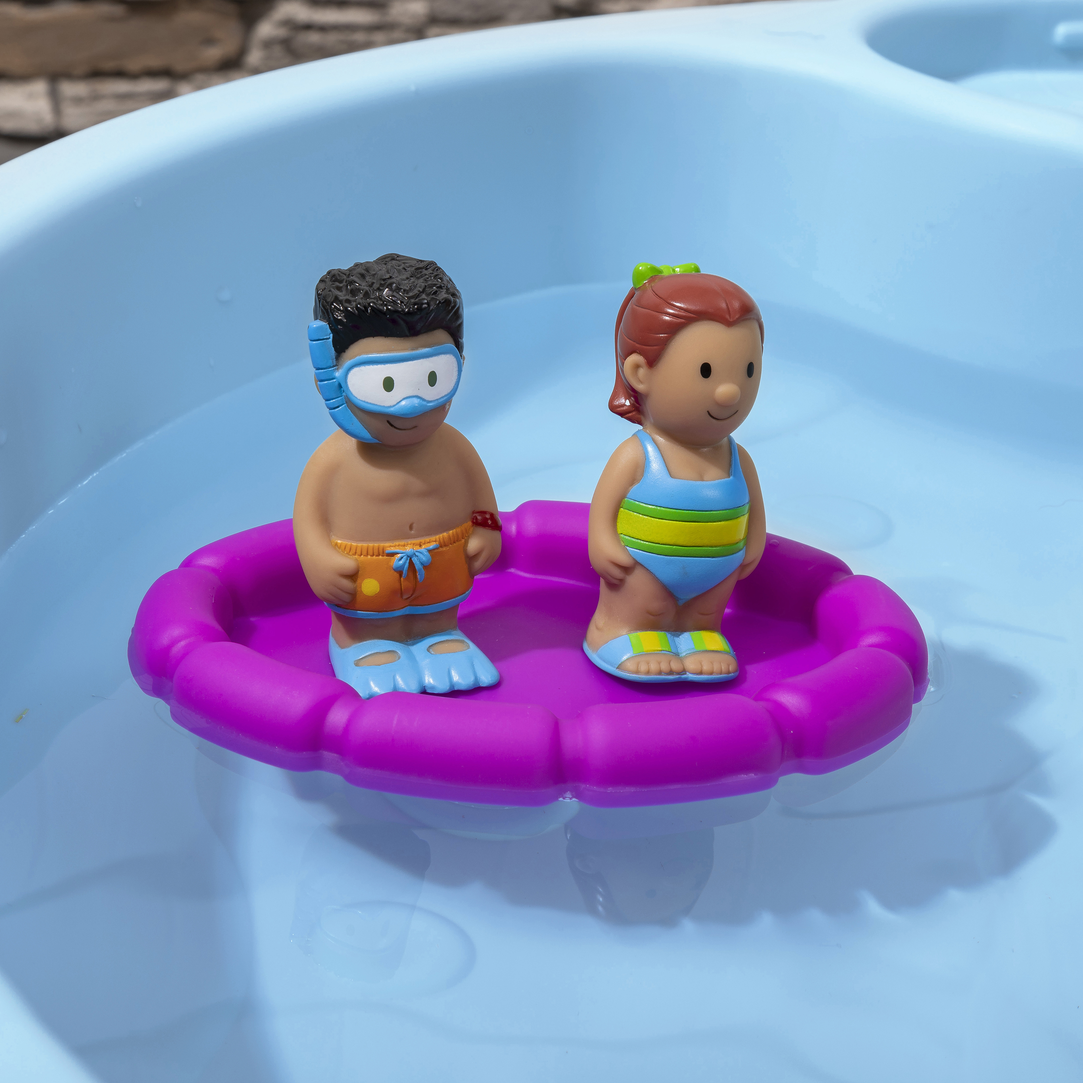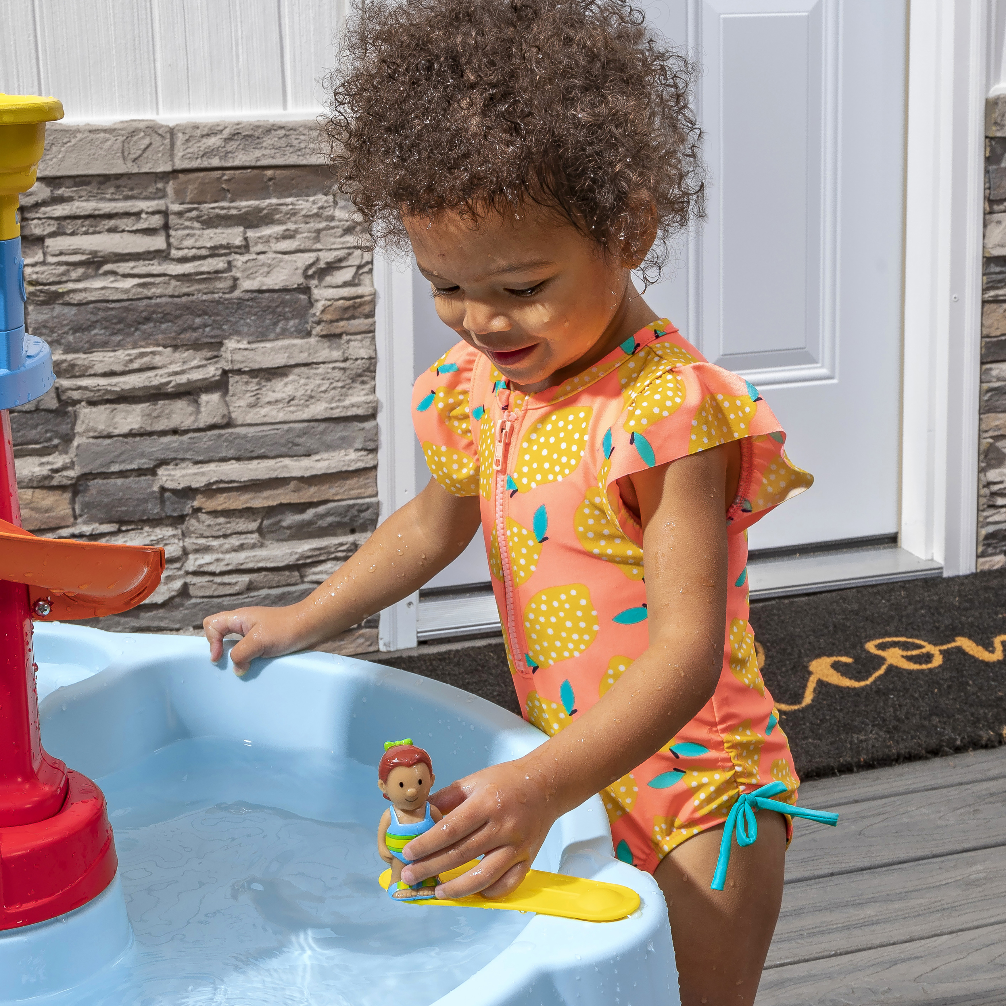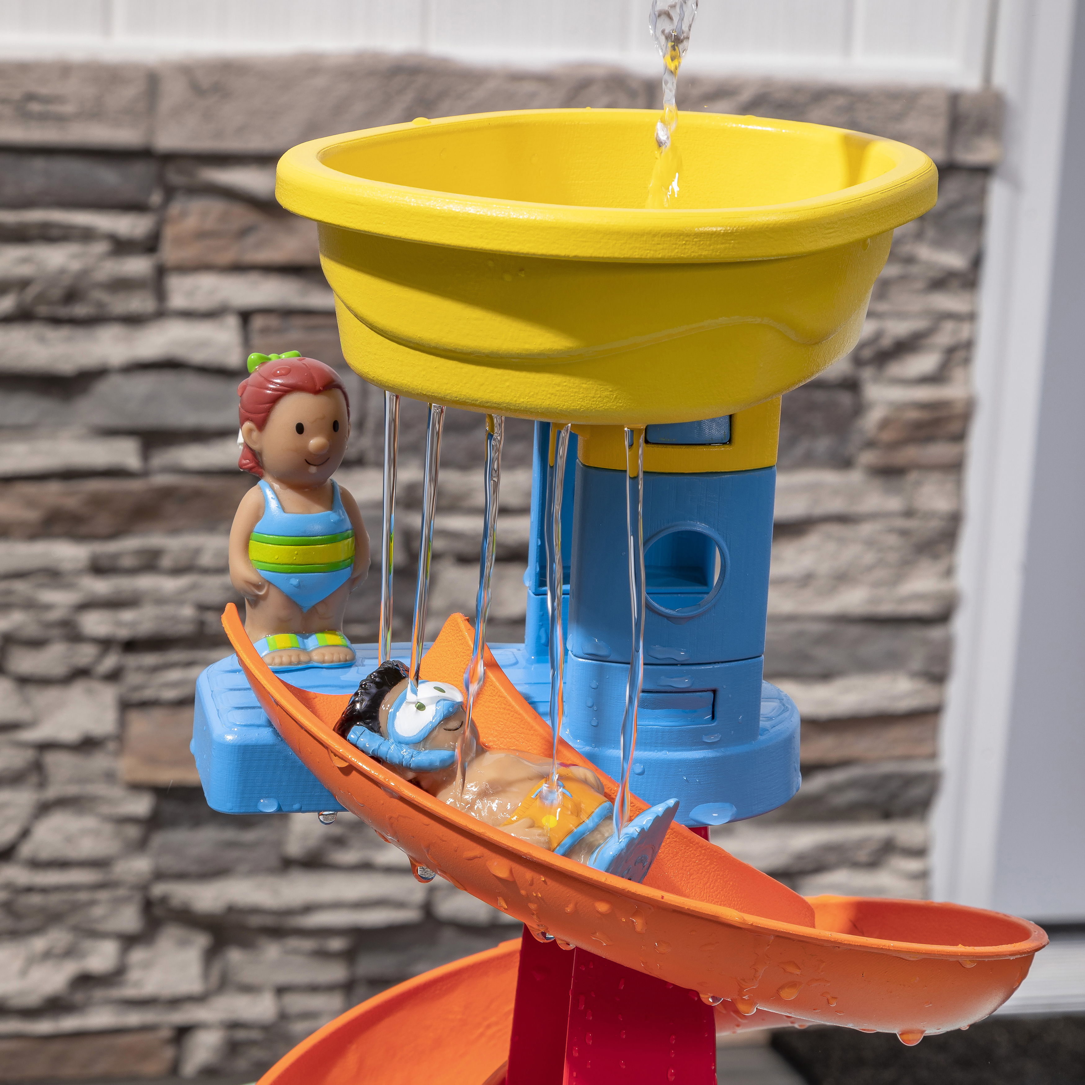 De meegeleverde speelfiguurtjes staan te popelen om hun avontuur te beginnen. Ze glijden snel naar beneden van de waterglijbaan en plonzen met een grote glimlach in de watervijver. Dankzij het unieke 360-graden ontwerp is deze watertafel ideaal voor kinderen om samen met hun vriendjes te spelen.