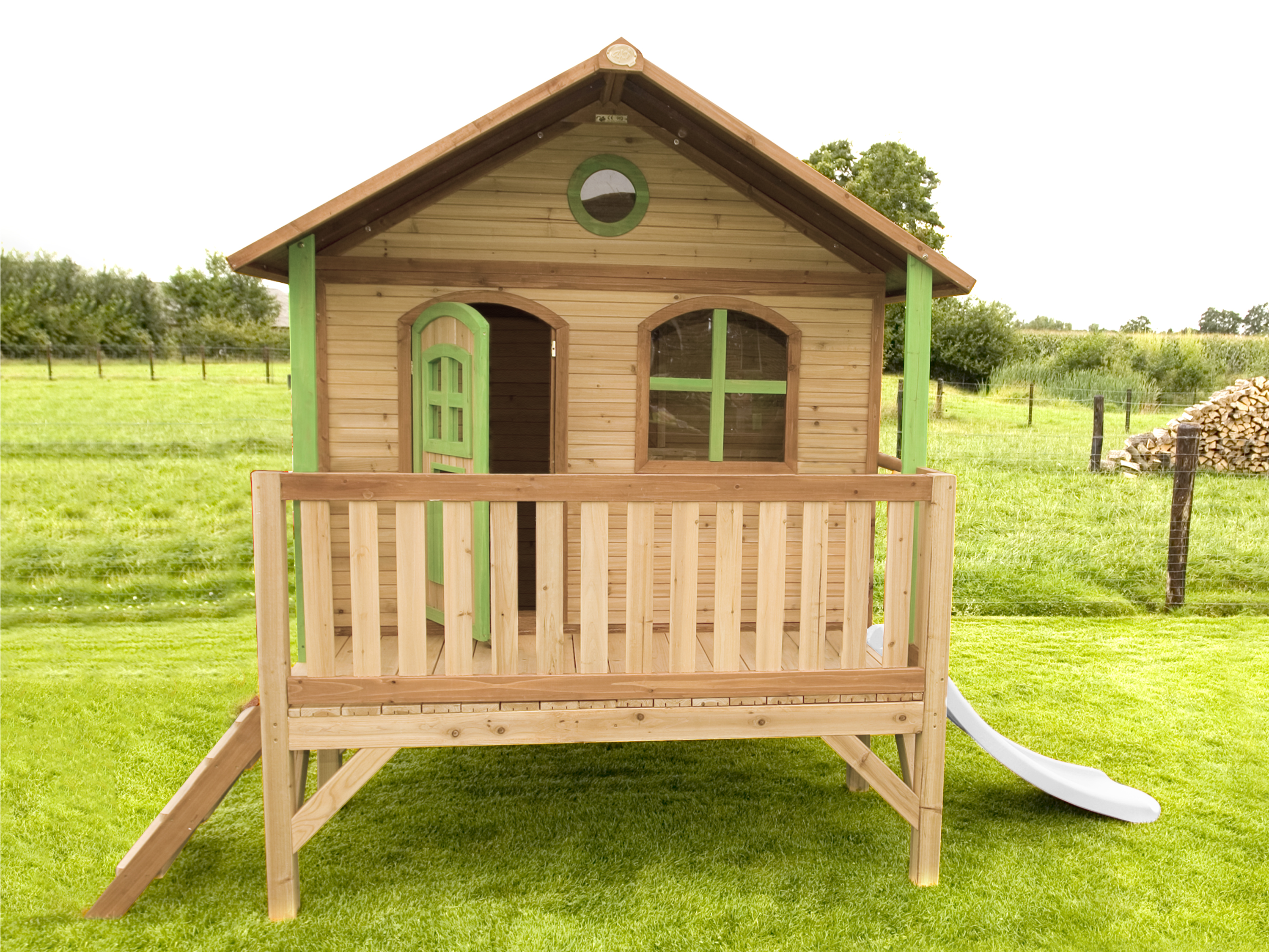 Kinderen vinden het heerlijk om met vriendjes of vriendinnetjes in het houten Stef Speelhuis Bruin/groen van AXI te spelen. Klimmen op de trap, over de veranda en snel weer naar beneden van de glijbaan. Hoe vaker ze naar beneden glijden, hoe leuker ze het vinden! In dit speelhuis kunnen ze elkaar de mooiste geheimen vertellen. Zodra ze de ramen en deur dicht doen, kan niemand ze meer afluisteren! Stef is een veelzijdig houten speelhuis met een halfronde deur en ramen. De deur heeft een brievenbus waar kinderen post doorheen kunnen gooien als ze postbodetje spelen. De bruin/groene kleuren zijn herkenbaar als de klassieke AXI producten welke al jaren enorm succesvol zijn voor jong en oud. Stef speelhuis heeft een platformhoogte van 58 cm en is uitgevoerd met een kleine glijbaan van 118 cm lang. Het trapje en glijbaan kunnen zowel links als rechts aan het speelhuis worden bevestigd.