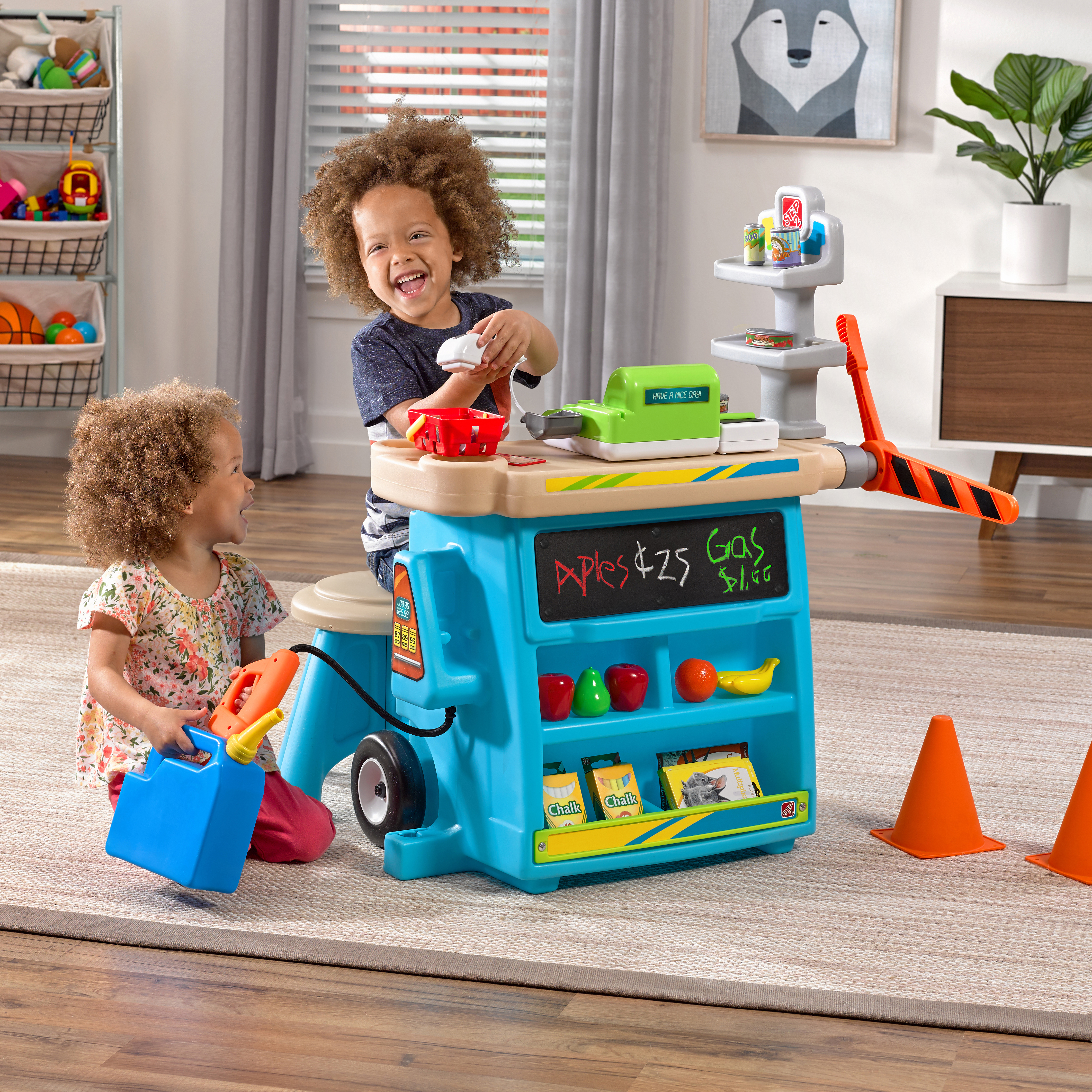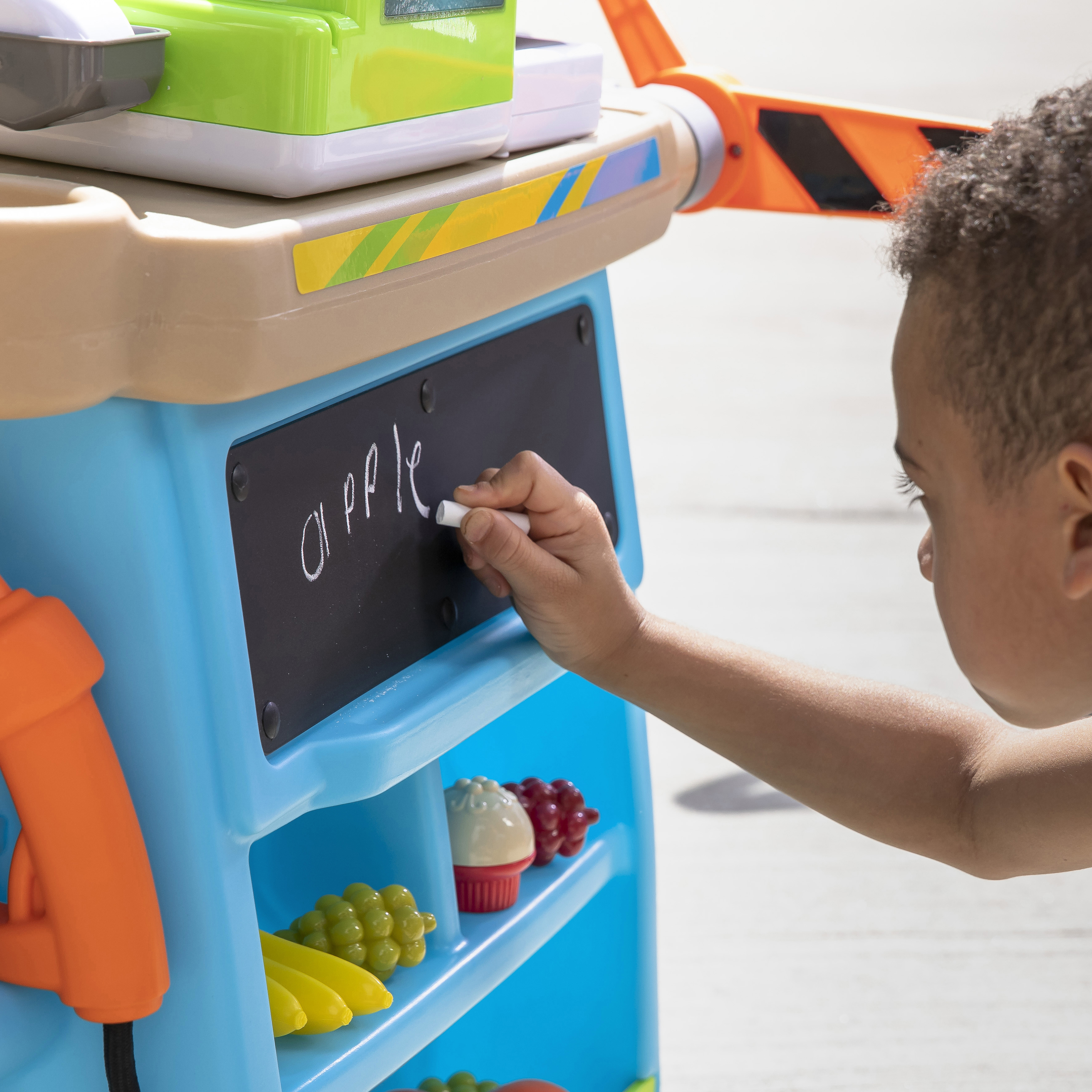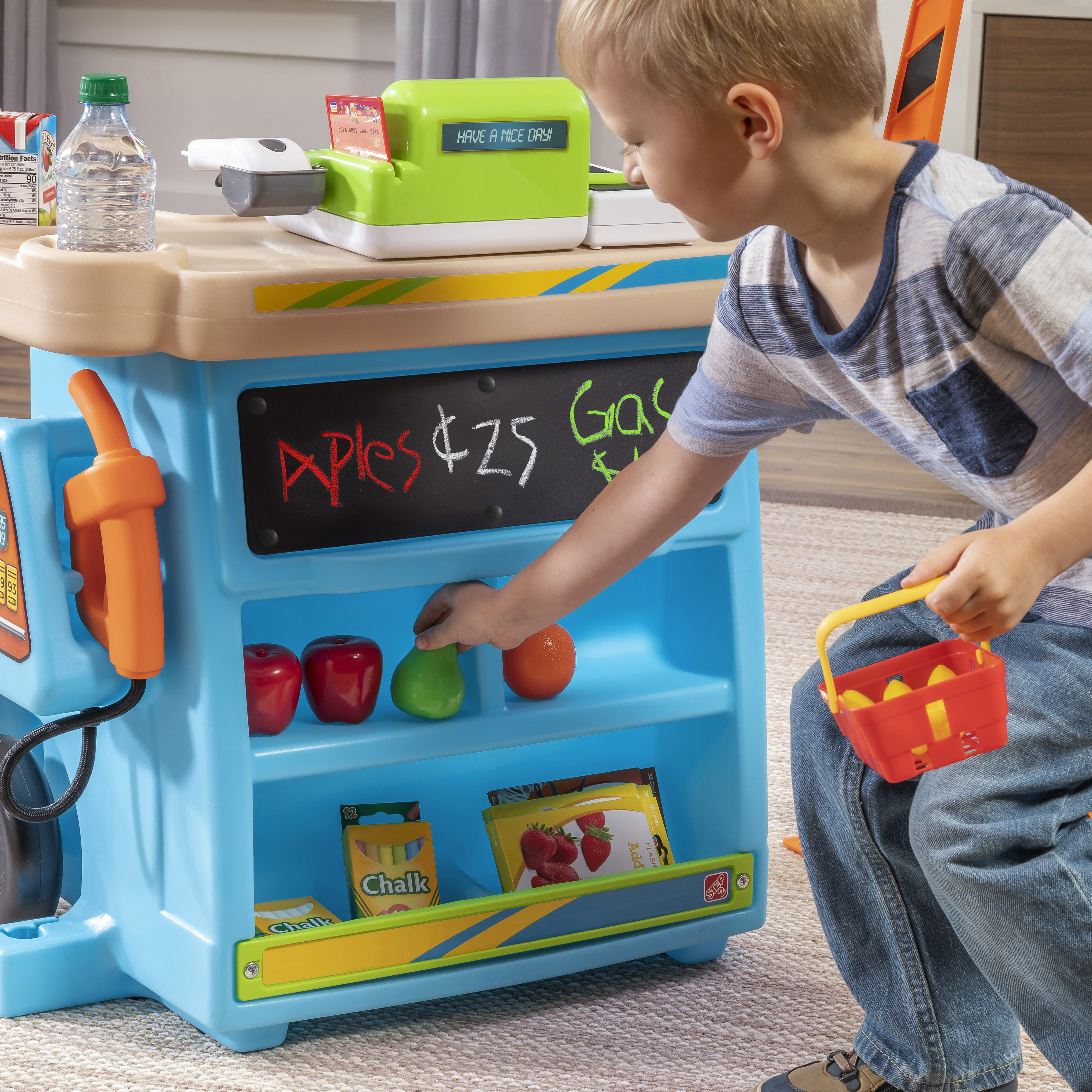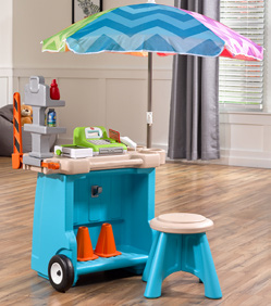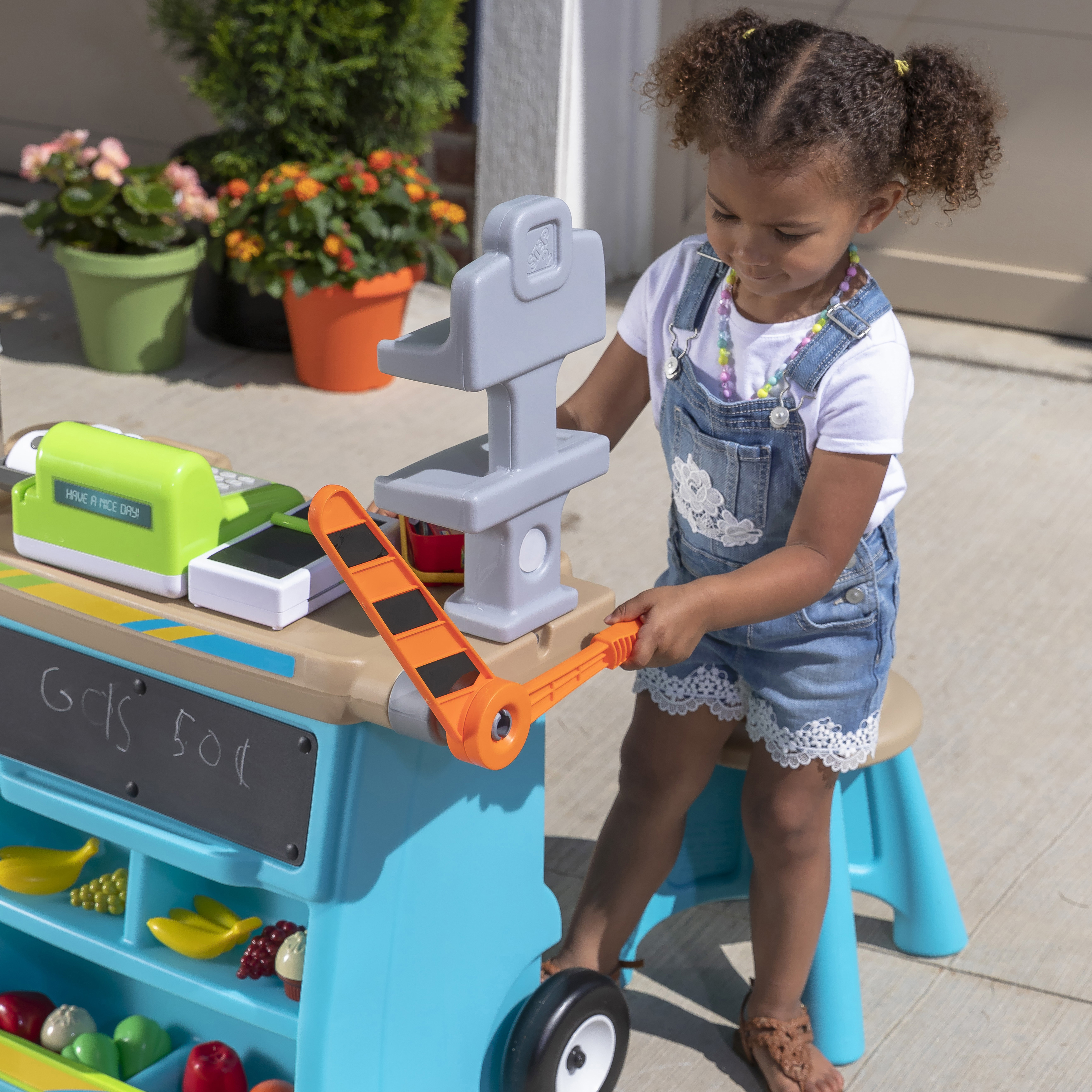 De Step2 Stop & Go Market is daar! Kleine ondernemers, zet jullie kraampjes maar klaar; we voorspellen veel plezier en leren! De Step2 Stop & Go markt heeft het allemaal! Deze speelgoed marktkraam heeft een benzinepomp, een tolhuisje, kegels, een krijtbord en een werkende kassier. Kinderen kunnen om de beurt spelen als de kassier en de klant. Kleintjes kunnen op hun fietsje of autootje naar de markt rijden om te tanken en tol te betalen. Ze kunnen zelfs het krijtbord gebruiken om dagaanbiedingen, benzineprijzen of de naam van hun markt op te schrijven. Deze speelmarkt heeft een parasol om kinderen te beschermen tegen de zon. Daarnaast heeft het wielen, zodat je kleintjes de markt gemakkelijk kunnen verplaatsen naar hun volgende locatie!