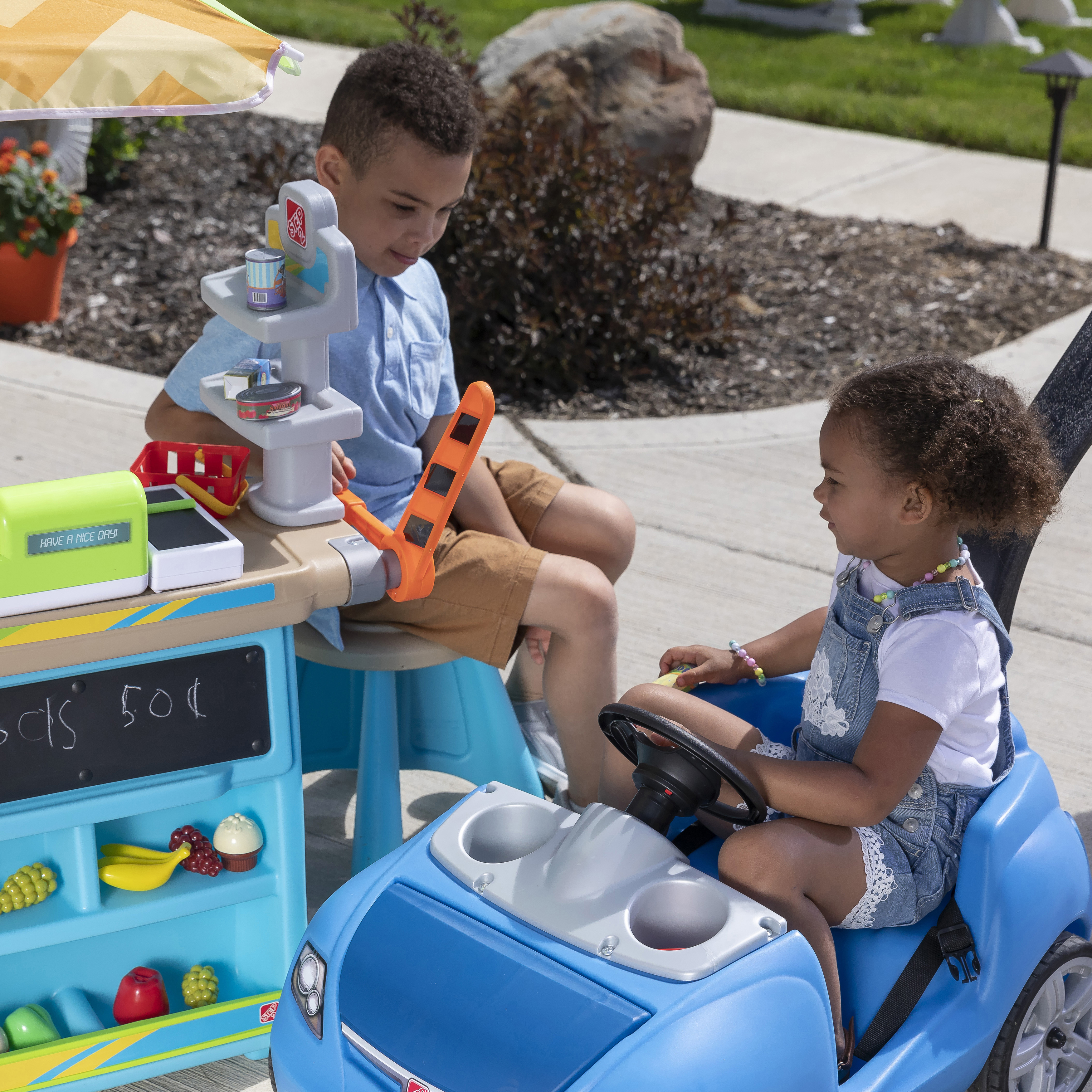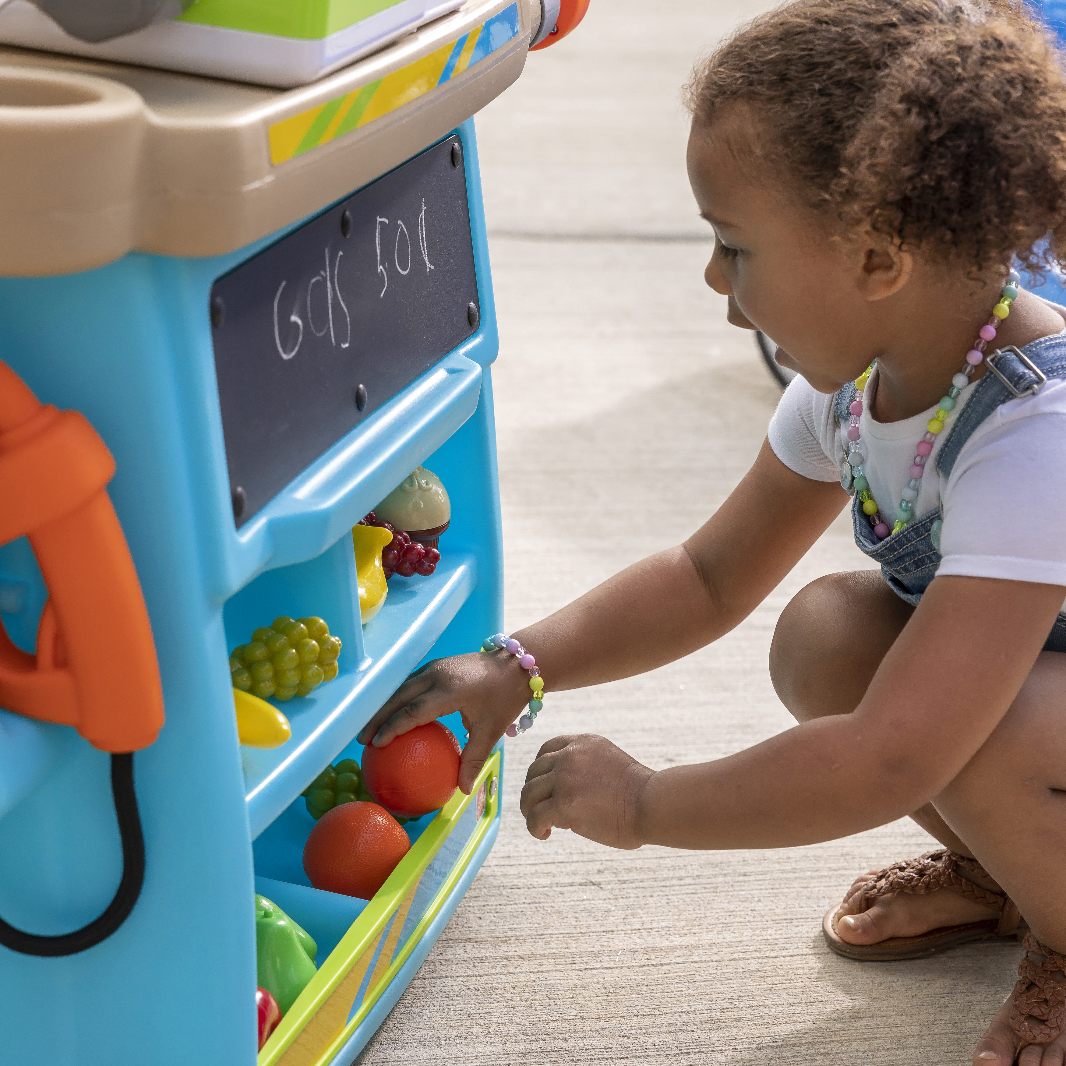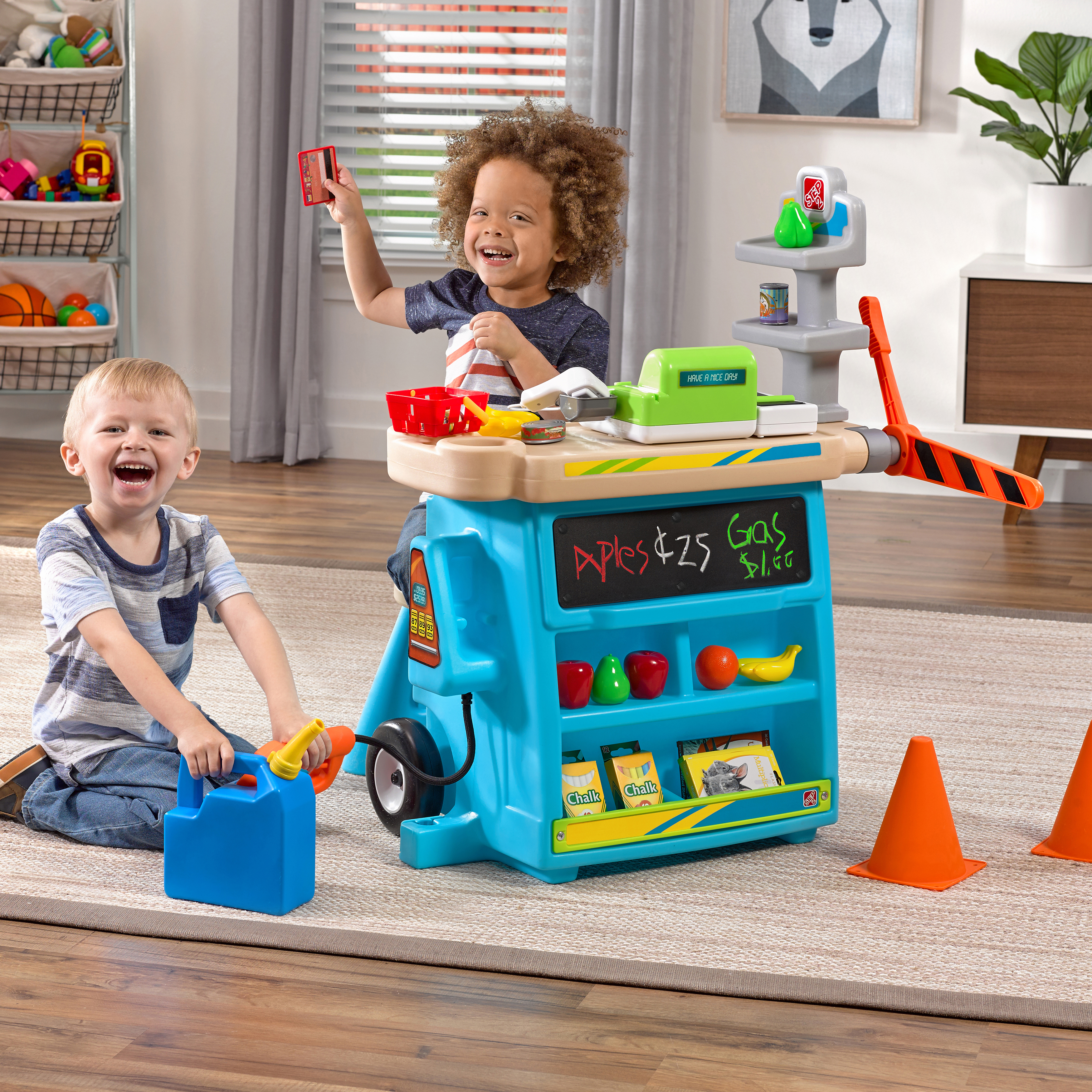De Step2 Stop & Go Market is daar! Kleine ondernemers, zet jullie kraampjes maar klaar; we voorspellen veel plezier en leren! De Step2 Stop & Go markt heeft het allemaal! Deze speelgoed marktkraam heeft een benzinepomp, een tolhuisje, kegels, een krijtbord en een werkende kassier. Kinderen kunnen om de beurt spelen als de kassier en de klant. Kleintjes kunnen op hun fietsje of autootje naar de markt rijden om te tanken en tol te betalen. Ze kunnen zelfs het krijtbord gebruiken om dagaanbiedingen, benzineprijzen of de naam van hun markt op te schrijven. Deze speelmarkt heeft een parasol om kinderen te beschermen tegen de zon. Daarnaast heeft het wielen, zodat je kleintjes de markt gemakkelijk kunnen verplaatsen naar hun volgende locatie!