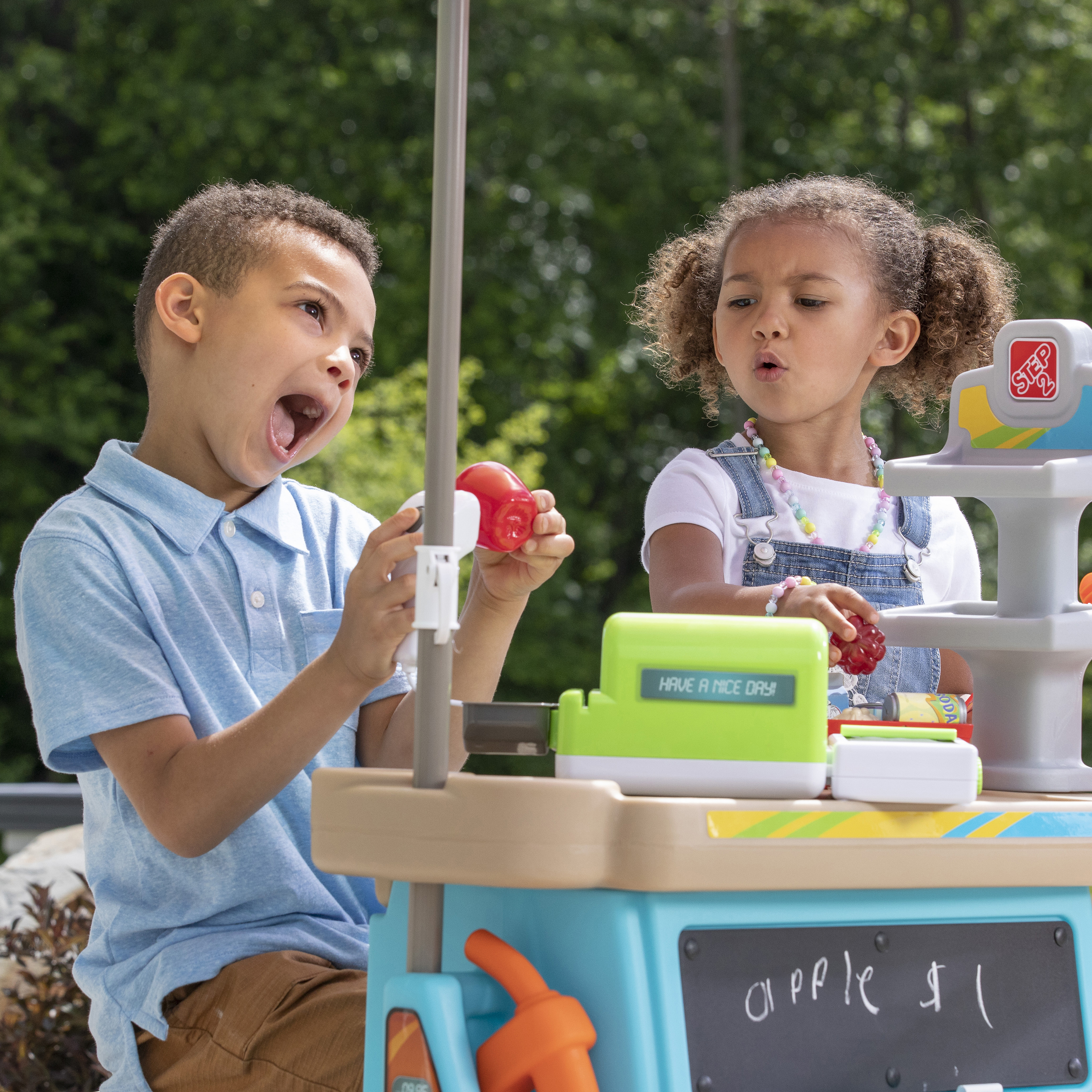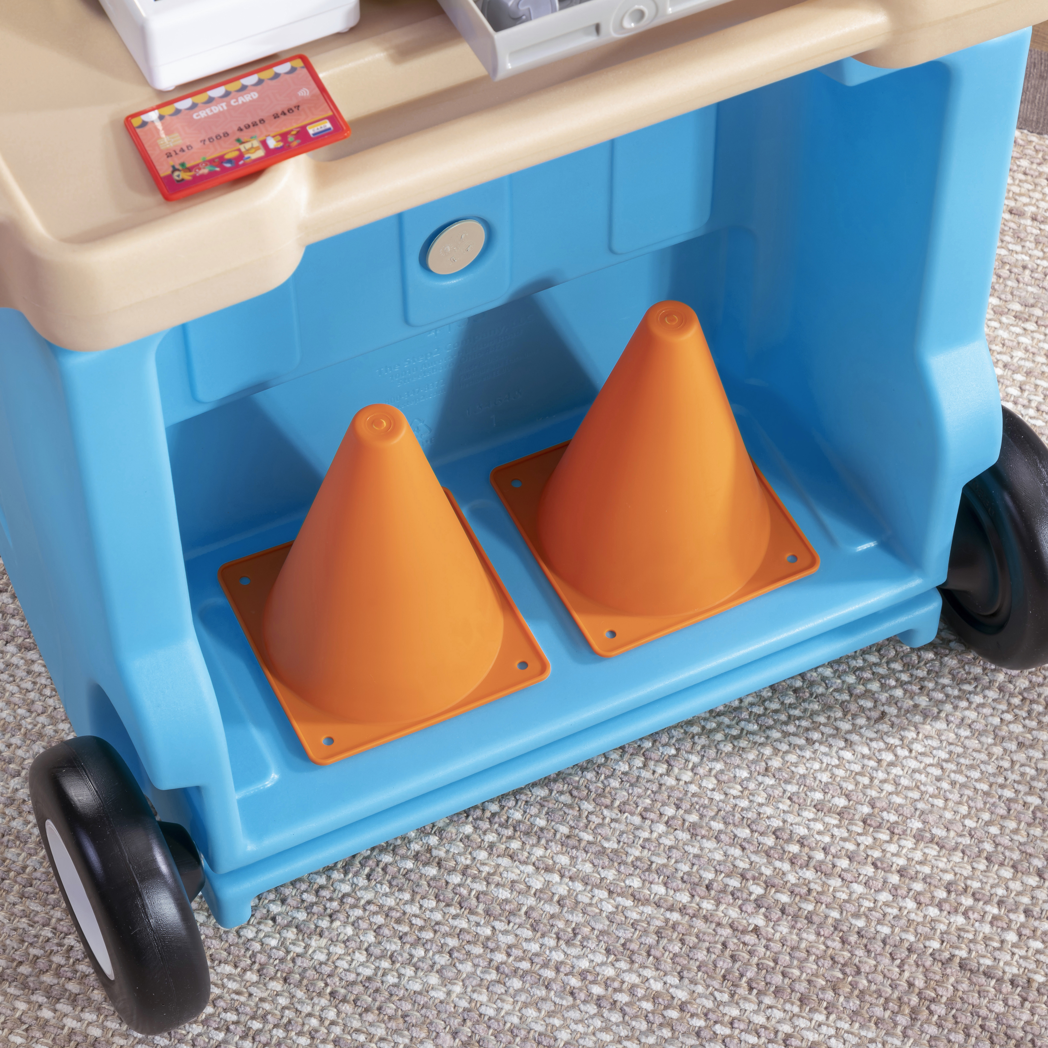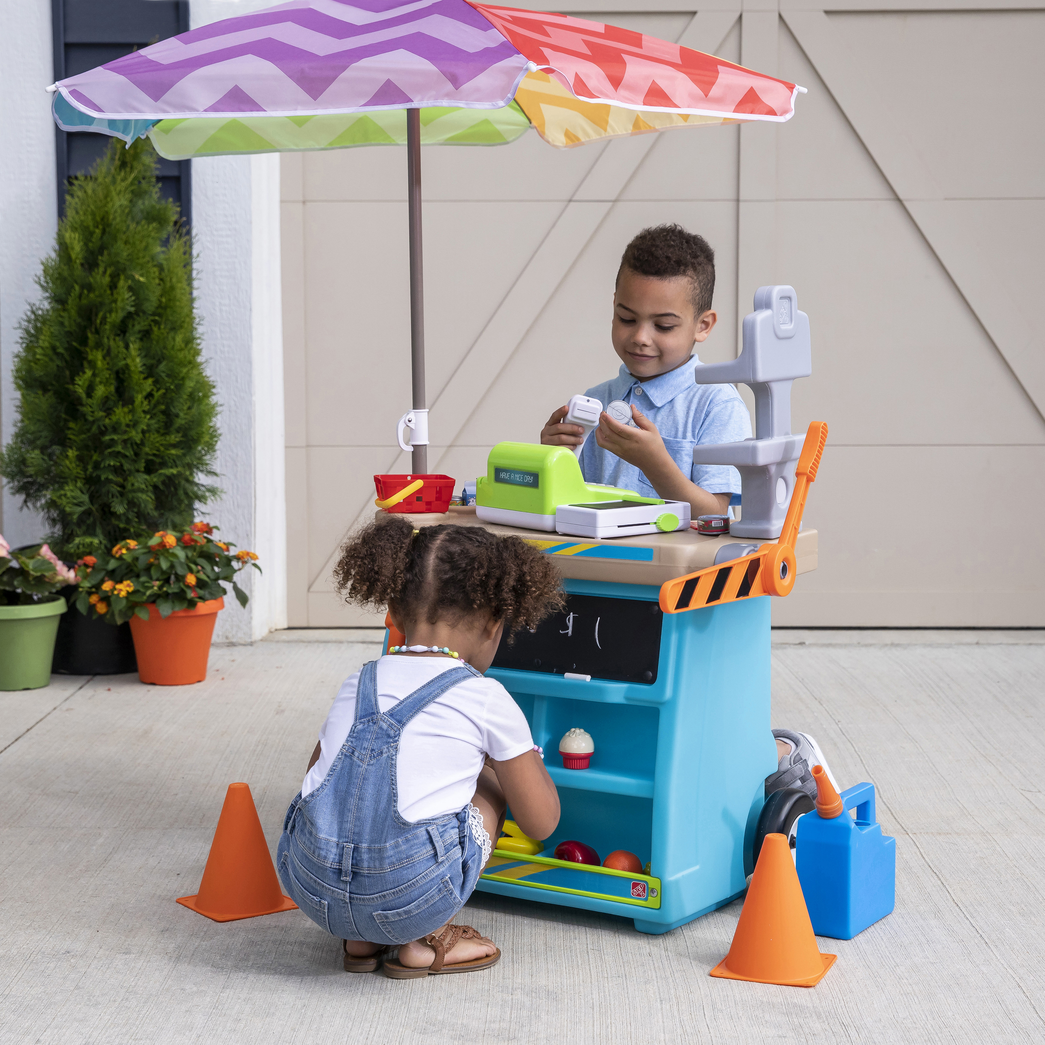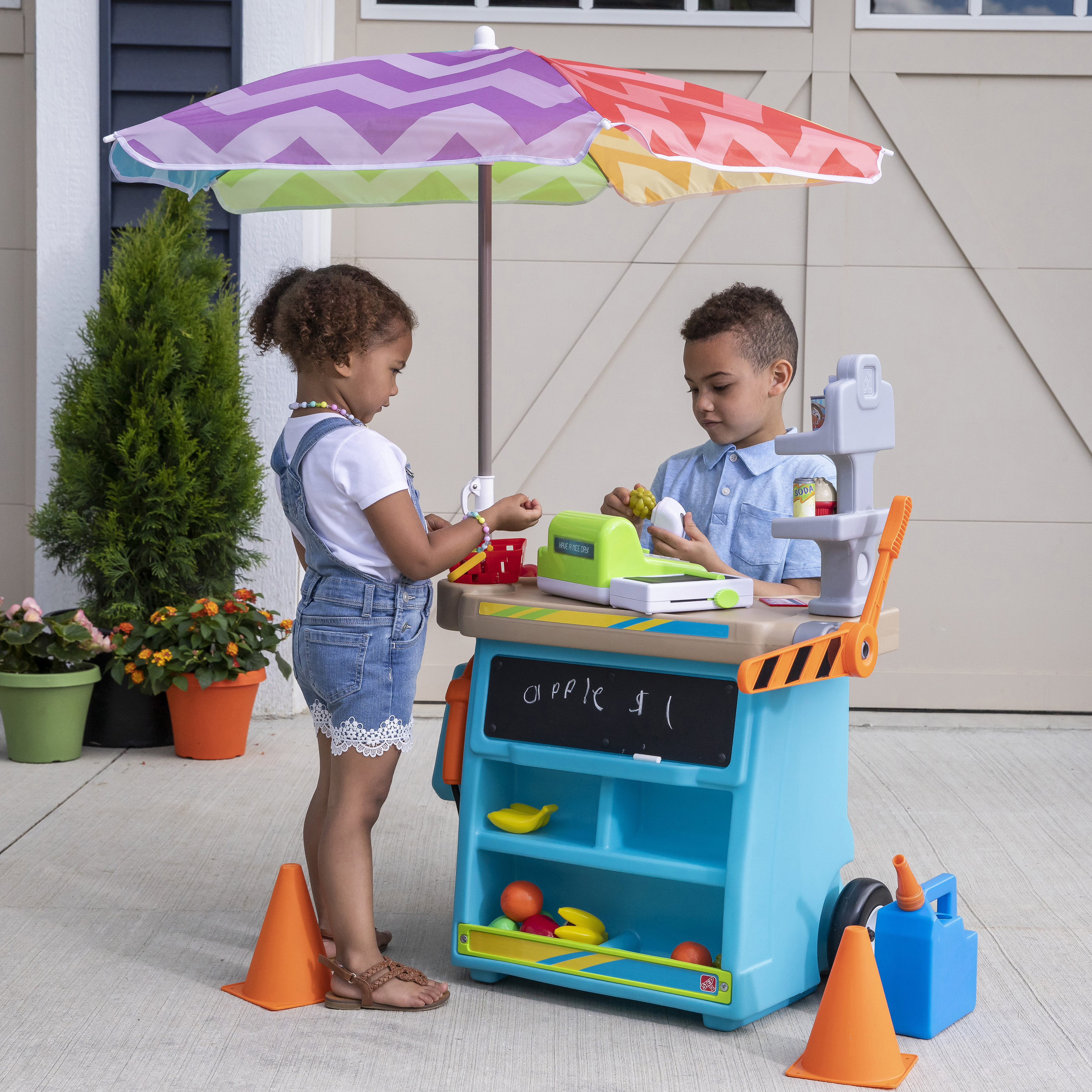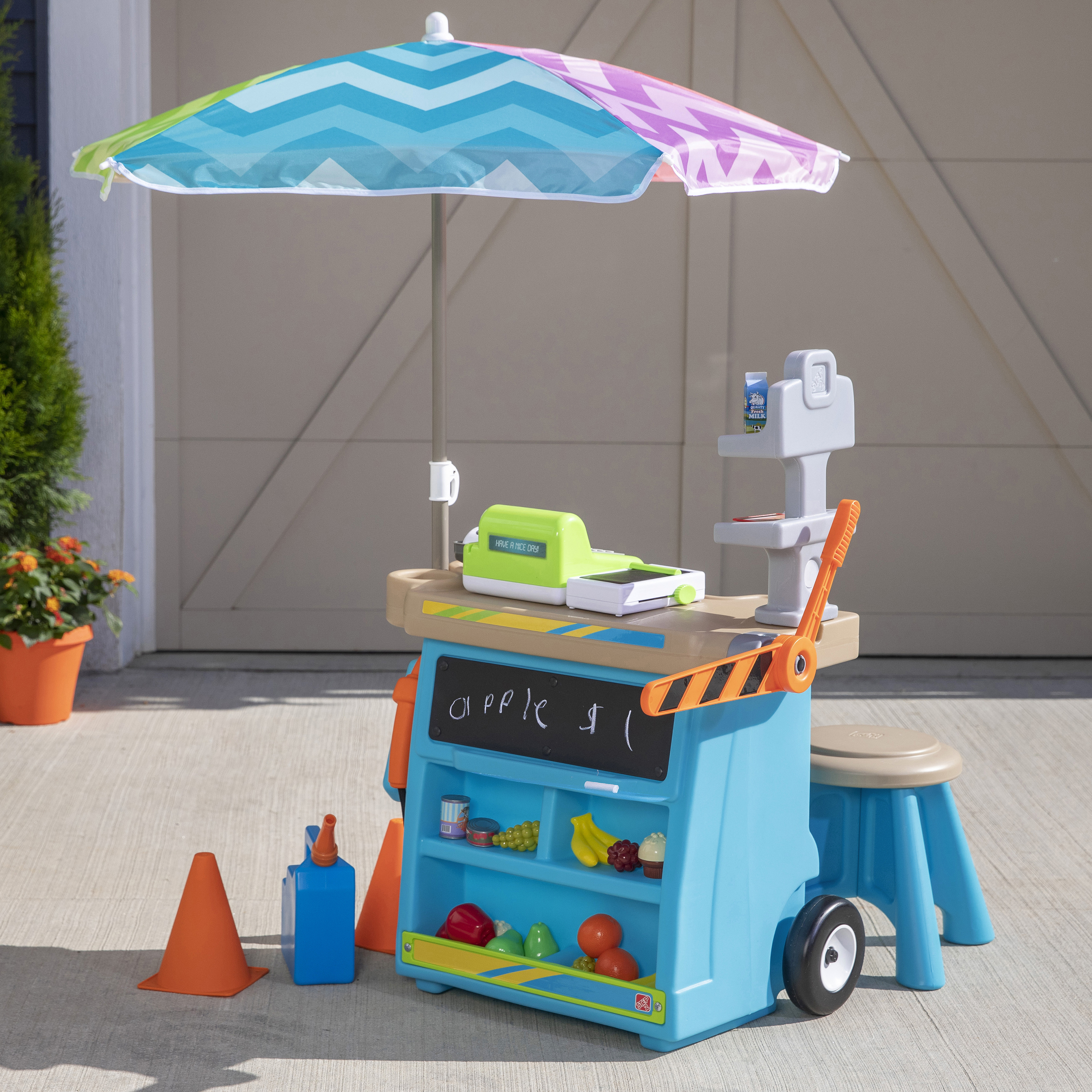 - In de doos: Mobiele marktbasis met wielen, 102 cm parasol, kruk, 2 verkeerskegels en tolarm, krijtbord, en elektronische kassa.