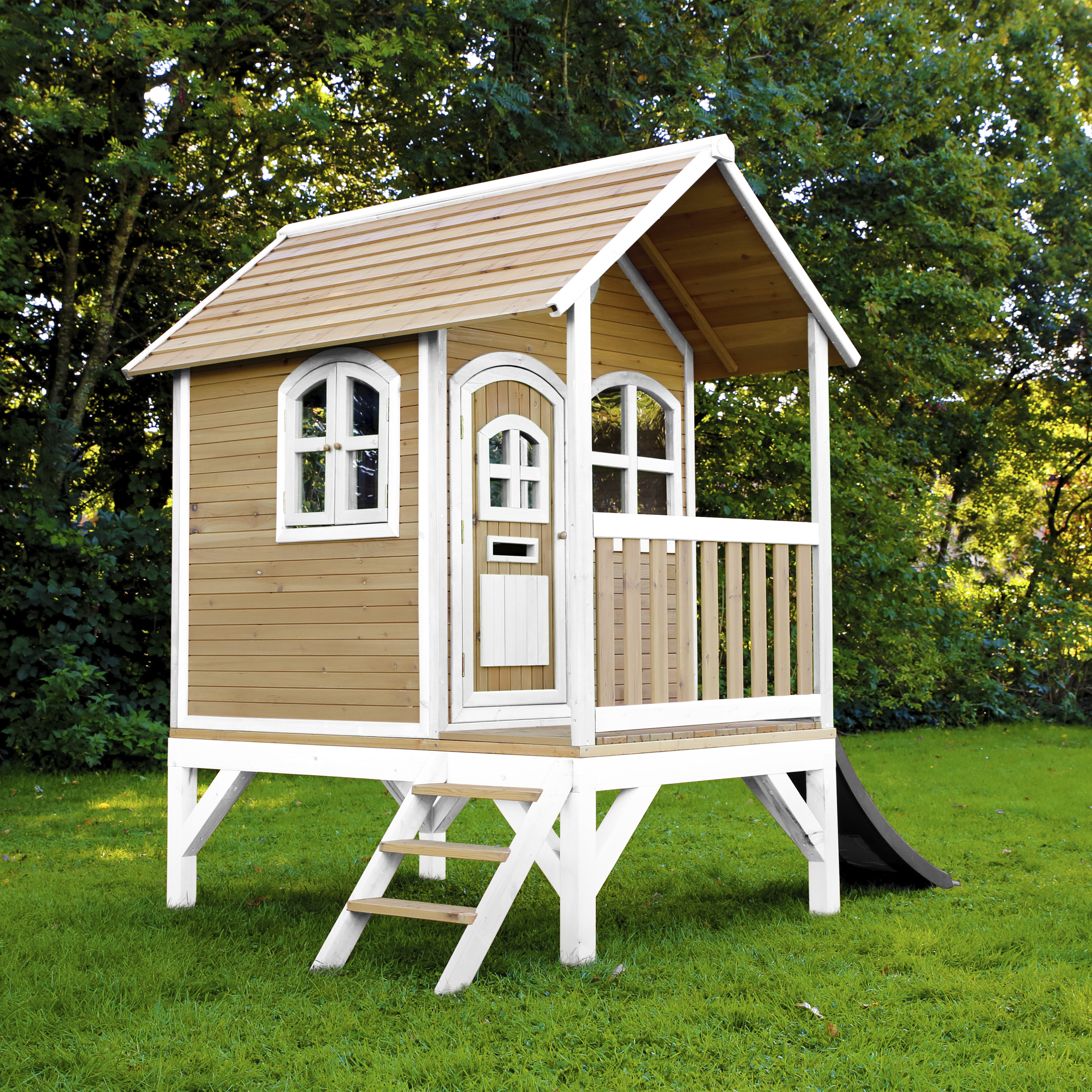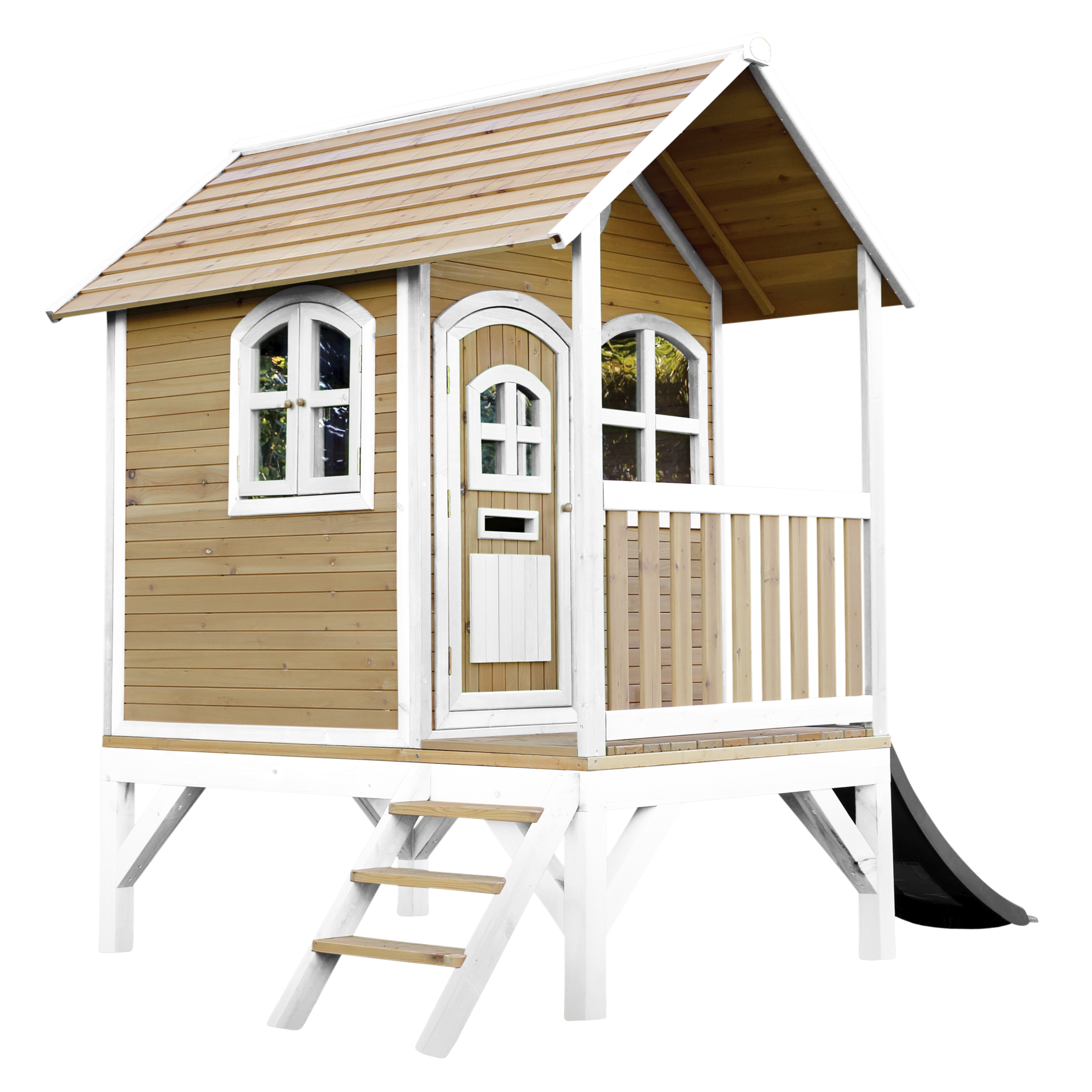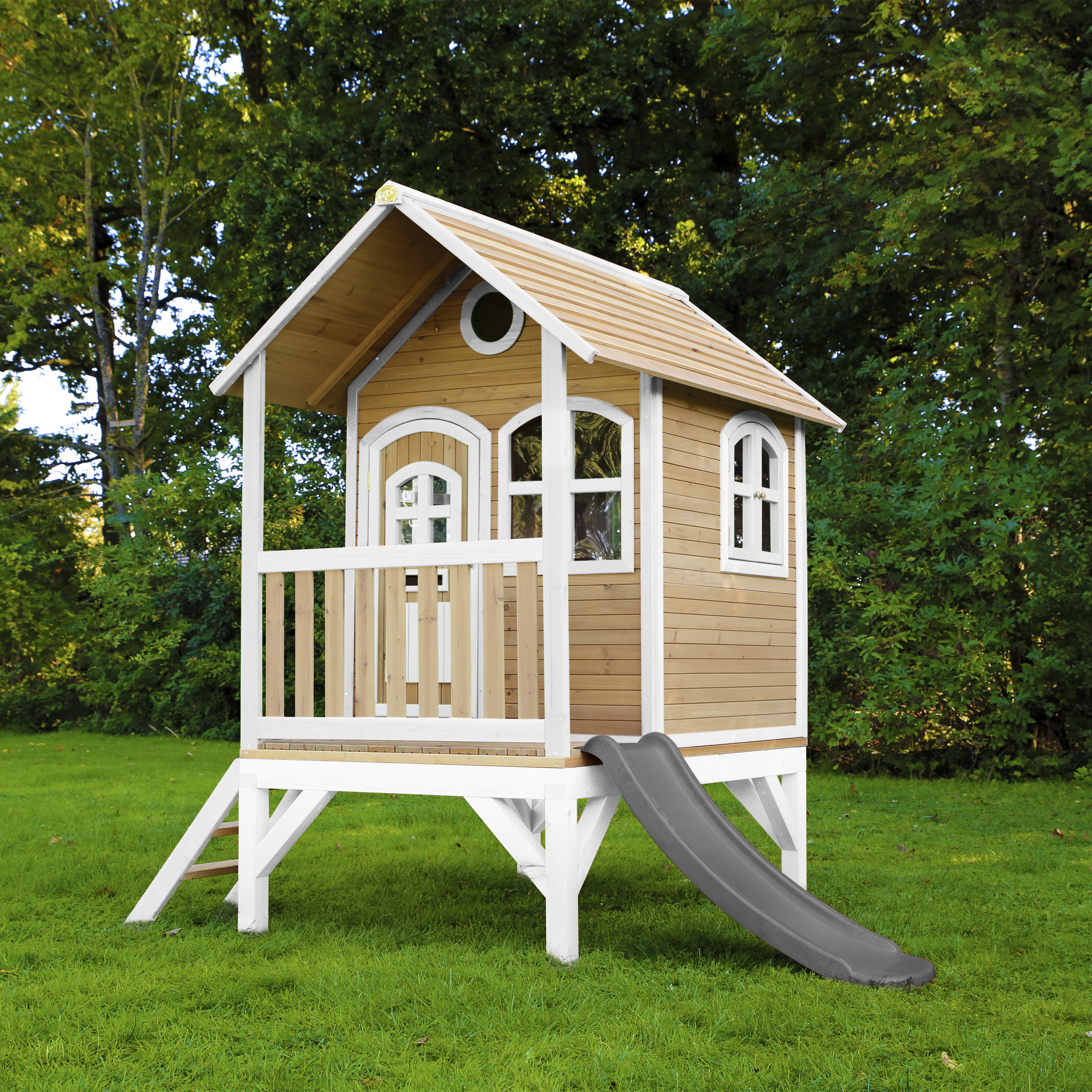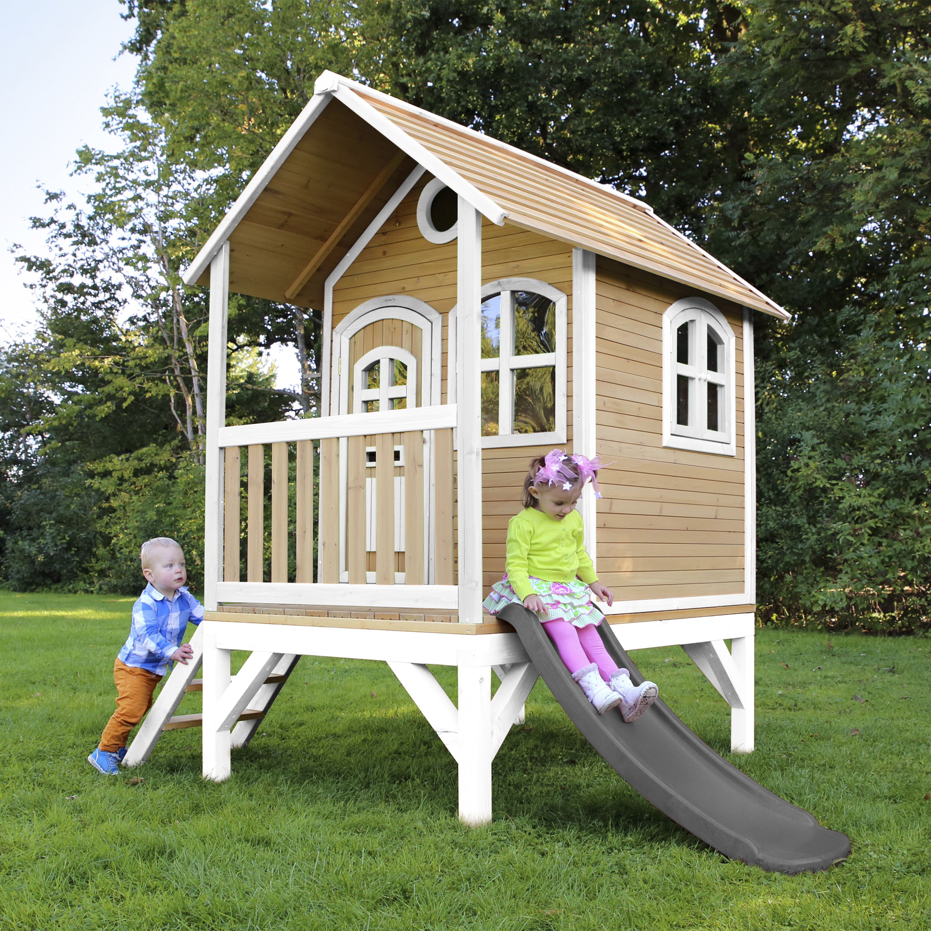 Kinderen vinden het heerlijk om met vriendjes of vriendinnetjes in het houten Tom Speelhuis Bruin/wit van AXI te spelen. Klimmen op de trap, over de veranda en snel weer naar beneden van de glijbaan. Hoe vaker ze naar beneden glijden, hoe leuker ze het vinden! In dit speelhuis kunnen ze elkaar de mooiste geheimen vertellen. Zodra ze de ramen en deur dicht doen, kan niemand ze meer afluisteren! Tom is een veelzijdig houten speelhuis met een halfronde deur en ramen. De deur heeft een brievenbus waar kinderen post doorheen kunnen gooien als ze postbodetje spelen. Het speelhuisje is uitgevoerd in moderne bruin/witte kleuren welke perfect in iedere hedendaagse tuin passen. Tom speelhuis heeft een platformhoogte van 58 cm en is uitgevoerd met een kleine glijbaan van 118 cm lang. Het trapje en glijbaan kunnen zowel links als rechts aan het speelhuis worden bevestigd.