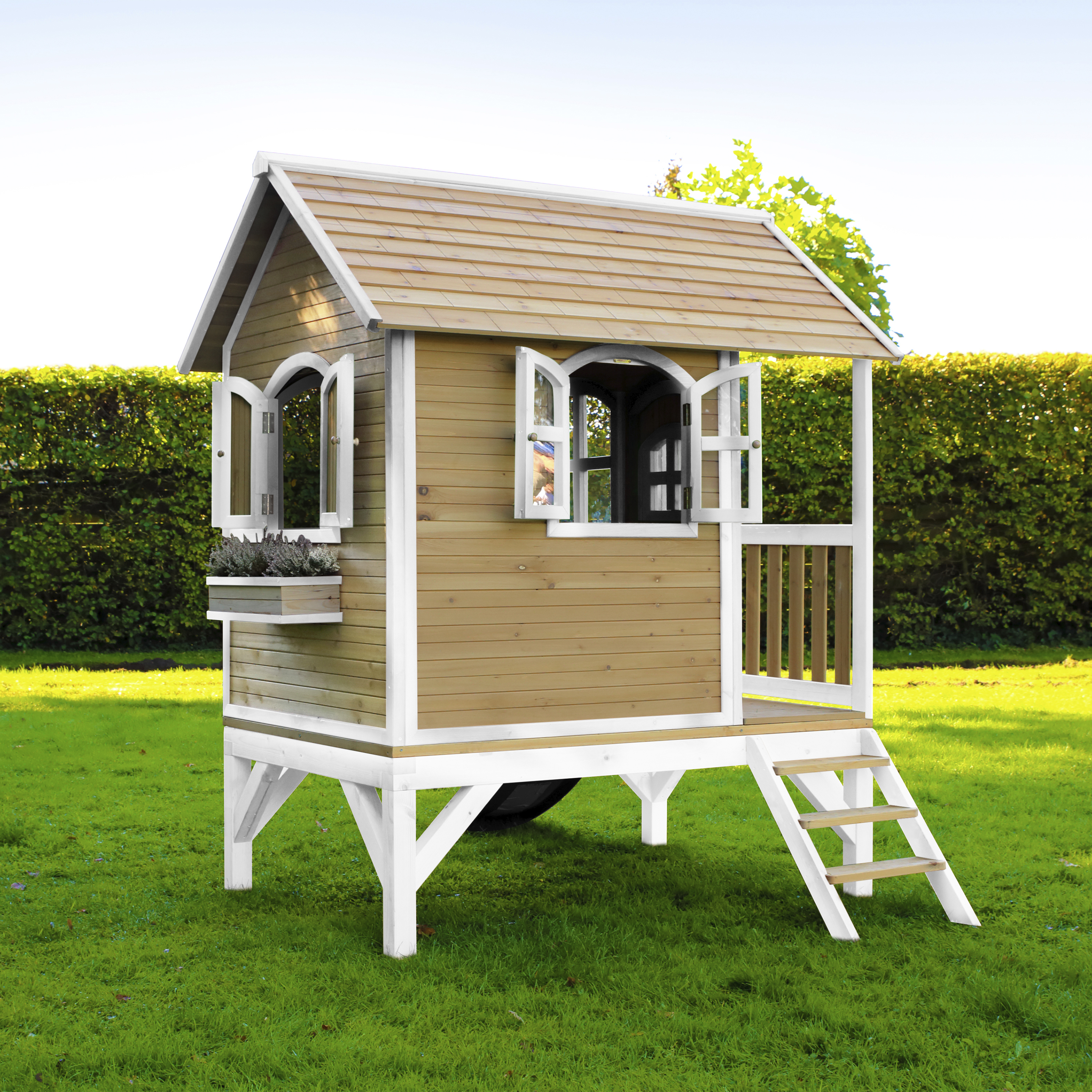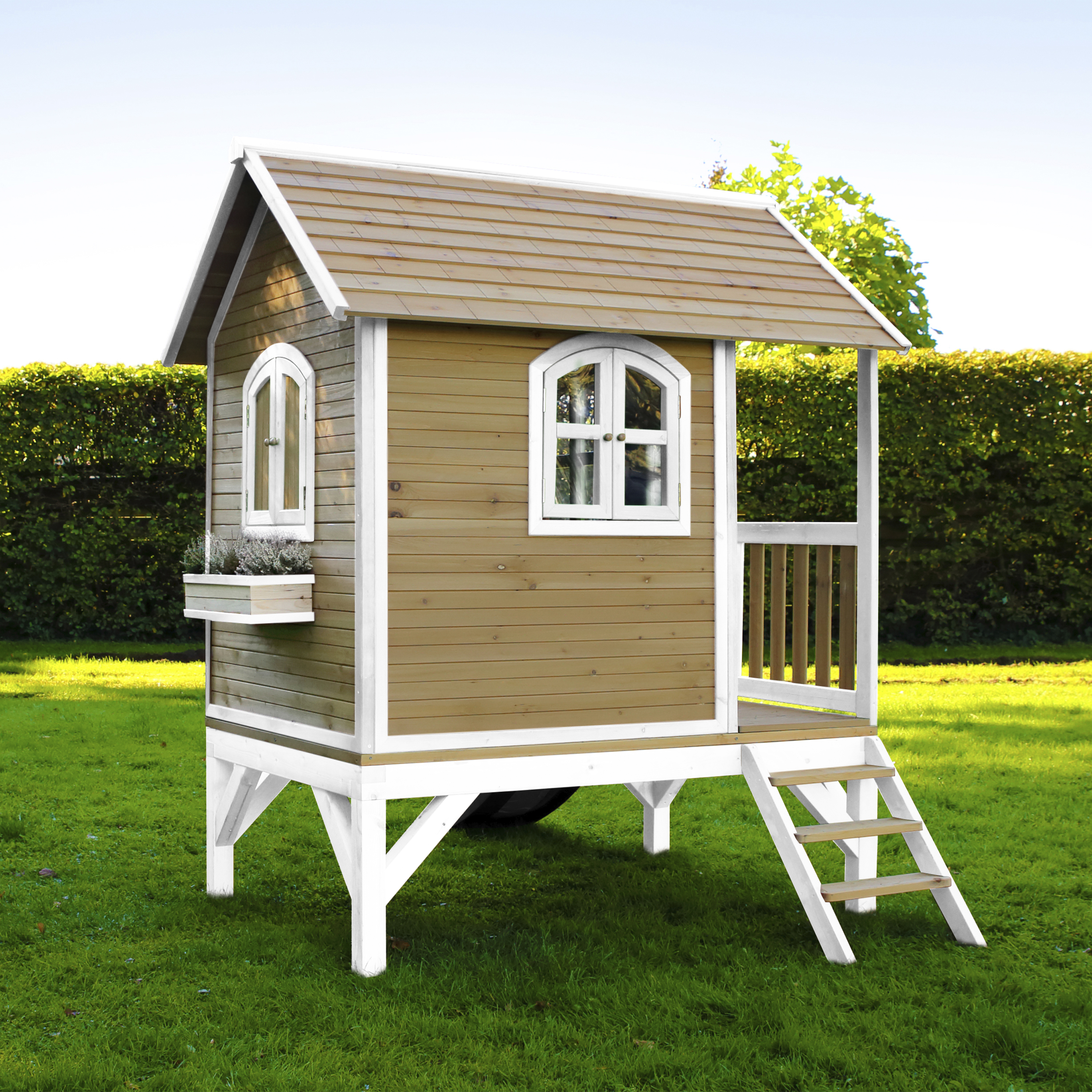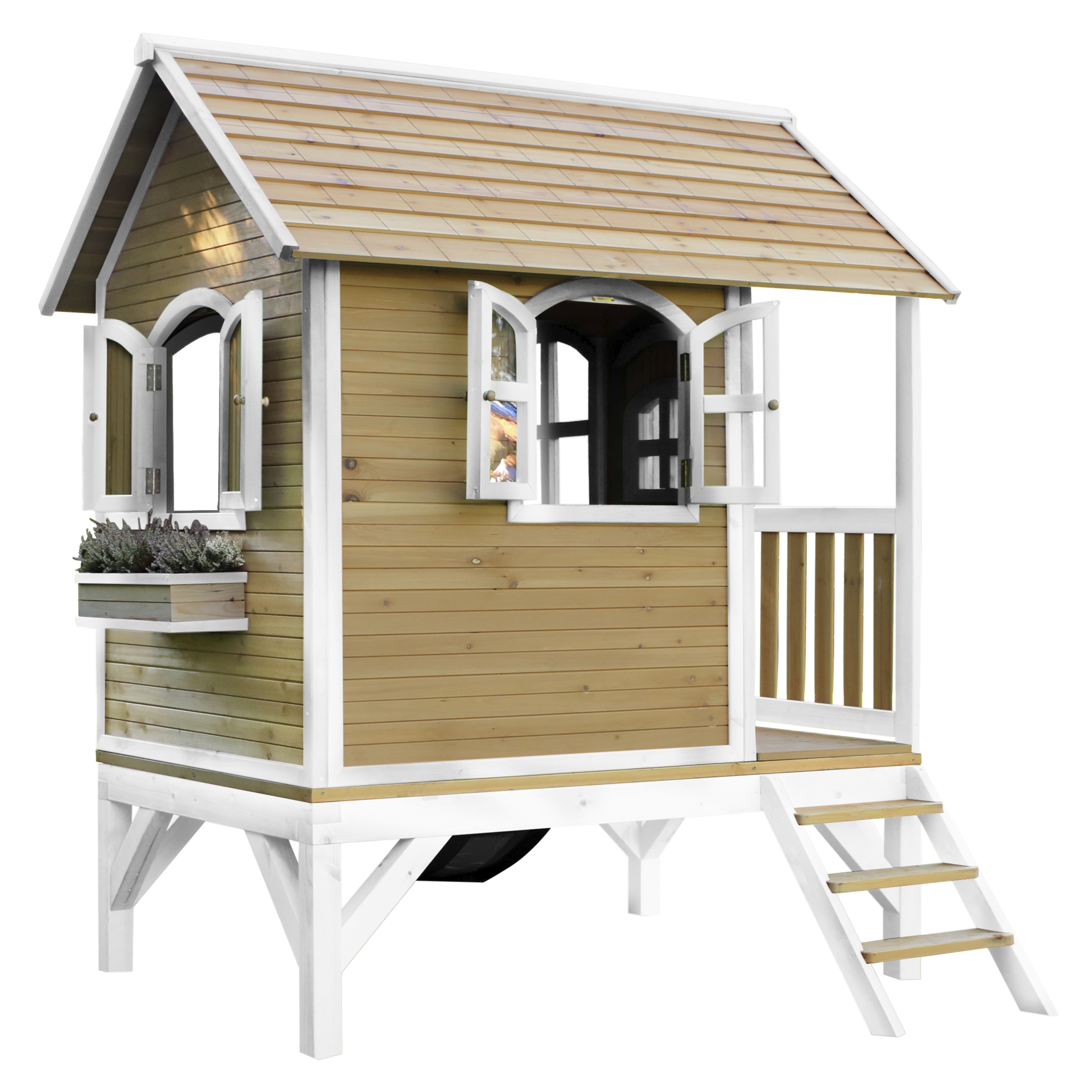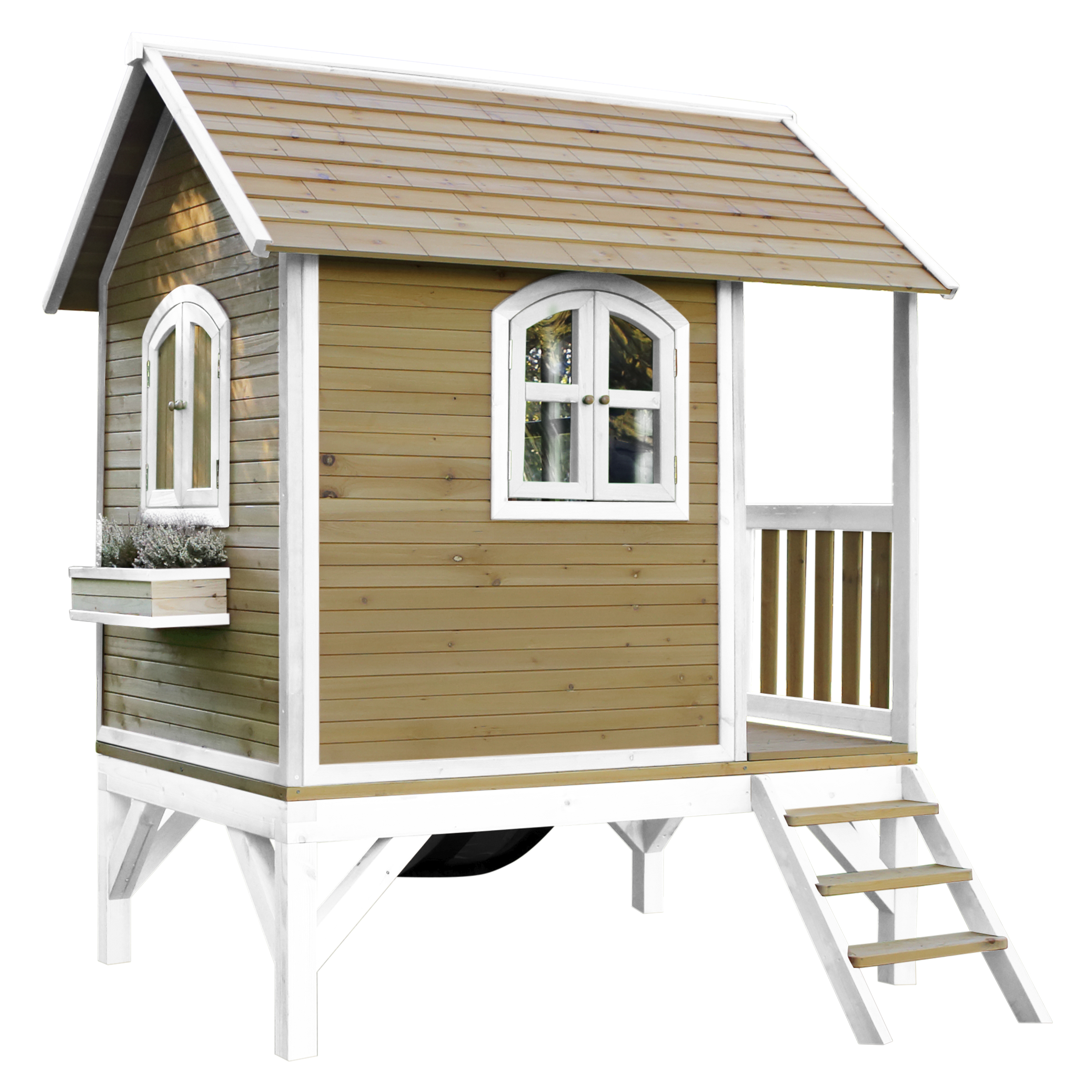 Kinderen vinden het heerlijk om met vriendjes of vriendinnetjes in het houten Tom Speelhuis Bruin/wit van AXI te spelen. Klimmen op de trap, over de veranda en snel weer naar beneden van de glijbaan. Hoe vaker ze naar beneden glijden, hoe leuker ze het vinden! In dit speelhuis kunnen ze elkaar de mooiste geheimen vertellen. Zodra ze de ramen en deur dicht doen, kan niemand ze meer afluisteren! Tom is een veelzijdig houten speelhuis met een halfronde deur en ramen. De deur heeft een brievenbus waar kinderen post doorheen kunnen gooien als ze postbodetje spelen. Het speelhuisje is uitgevoerd in moderne bruin/witte kleuren welke perfect in iedere hedendaagse tuin passen. Tom speelhuis heeft een platformhoogte van 58 cm en is uitgevoerd met een kleine glijbaan van 118 cm lang. Het trapje en glijbaan kunnen zowel links als rechts aan het speelhuis worden bevestigd.