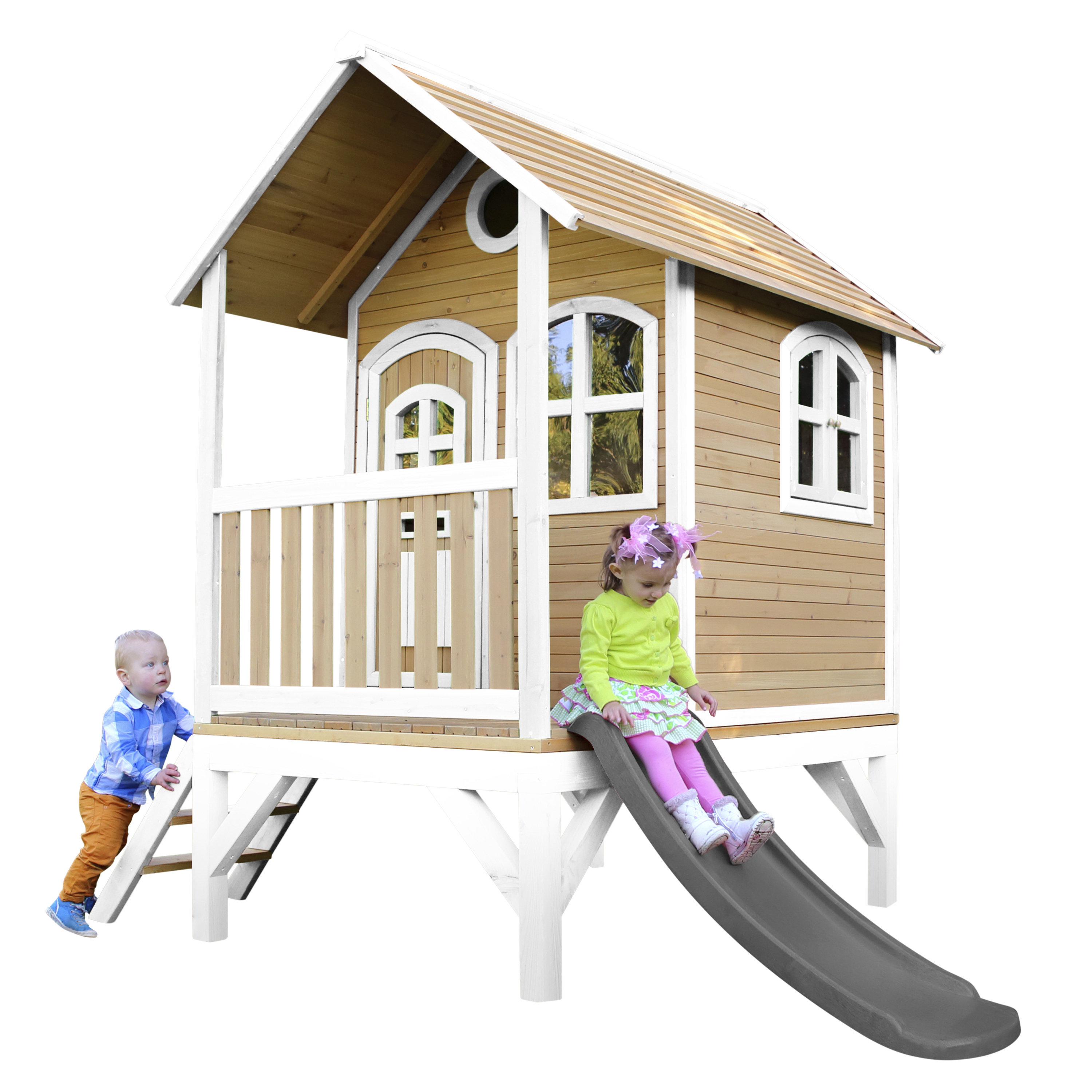 Productinformatie "Tom Speelhuis Bruin/wit - Grijze glijbaan"