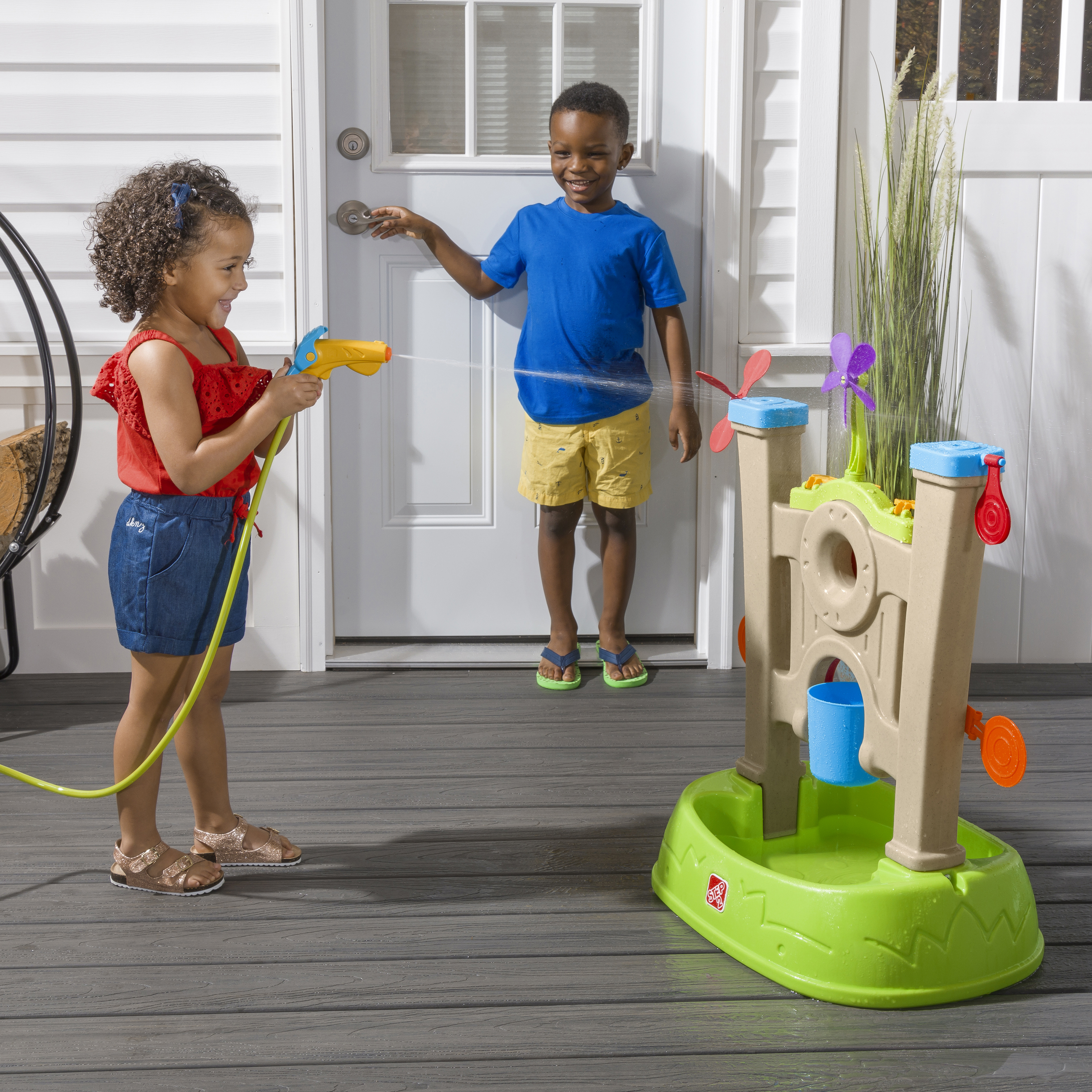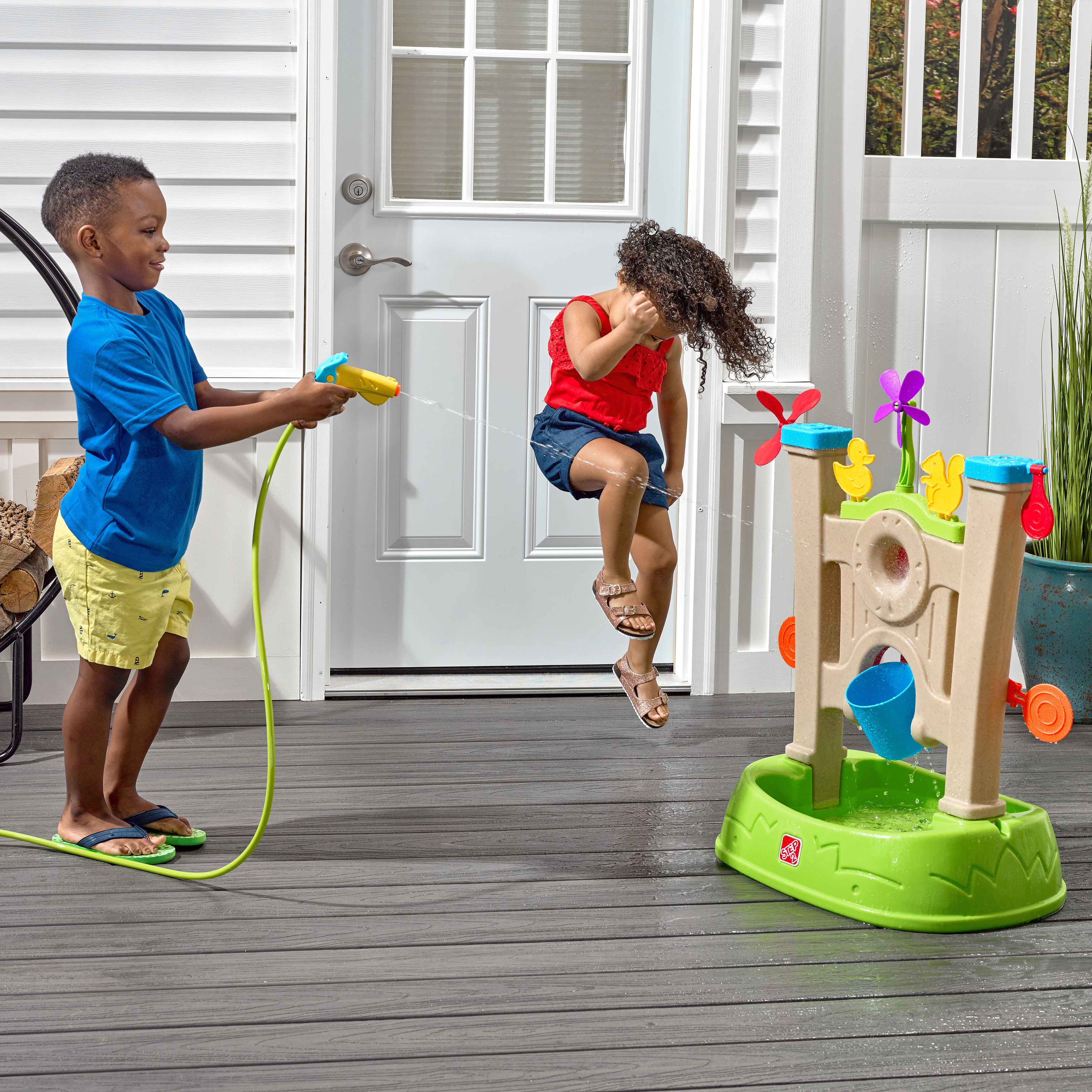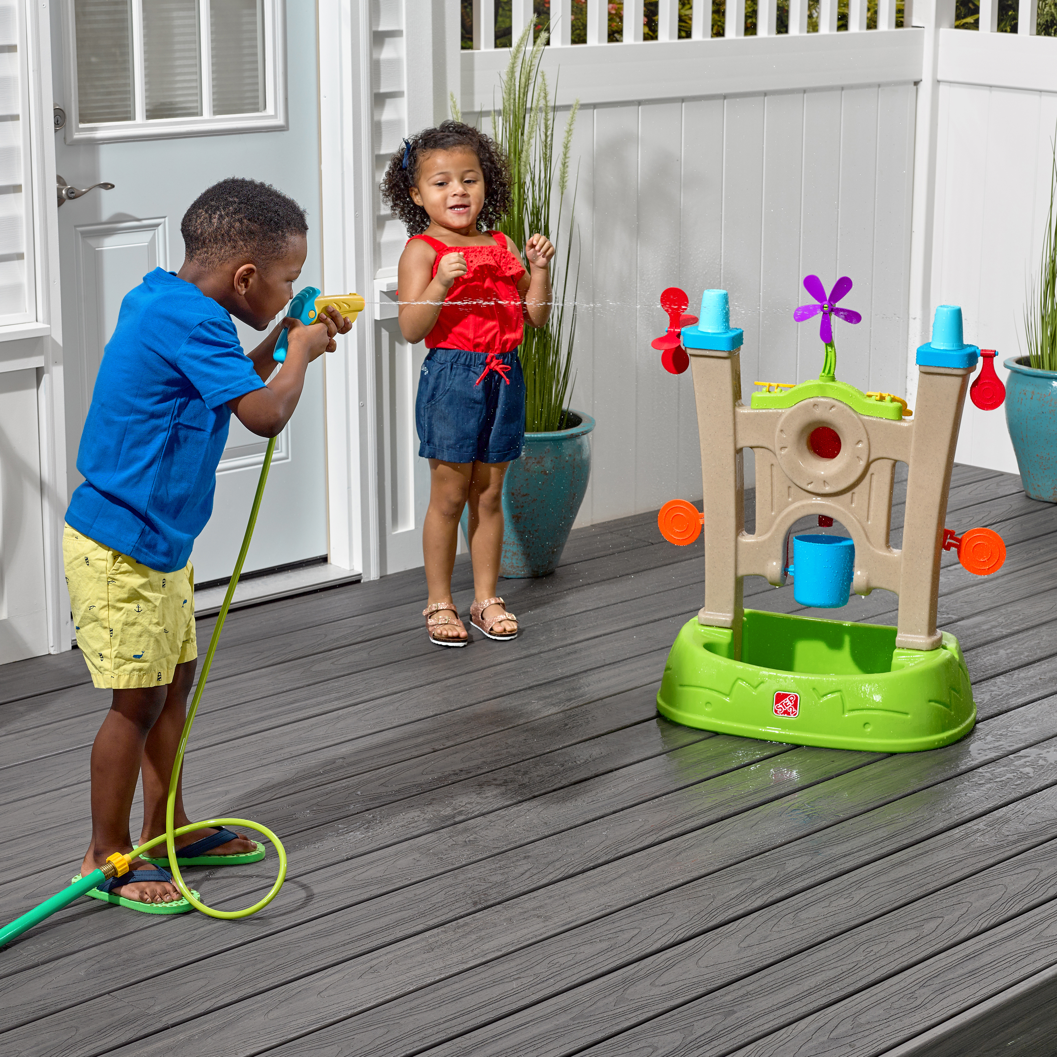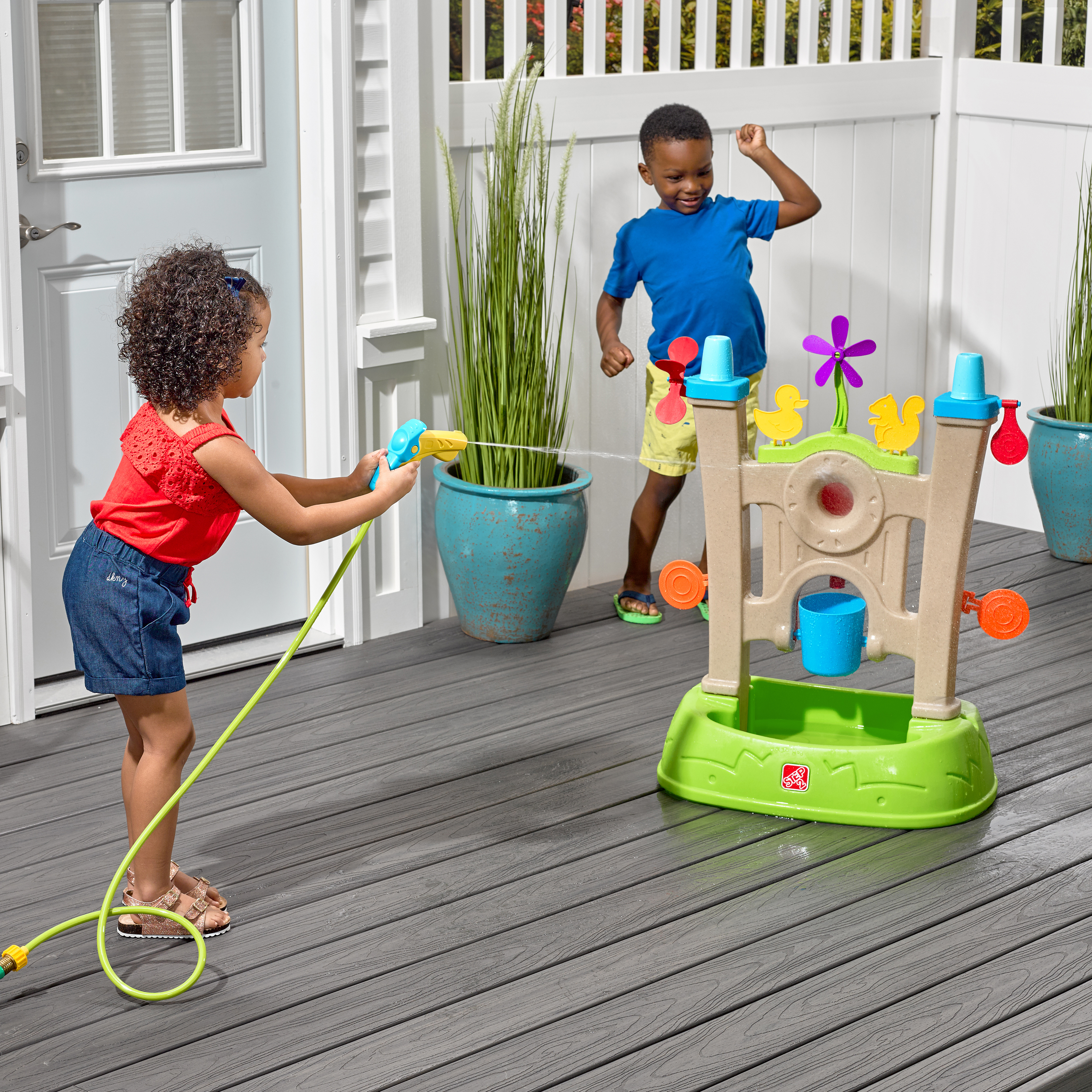 Met de Step2 Waterpark Arcade breng je het spannende waterspelplezier in arcade-thema naar je achtertuin! Tal van doelwitten voor het waterspel van de kinderen zijn opgesteld en klaar om ze met de waterspuit naar beneden te laten spuiten, allemaal op een grote wand met een brede basis voor extra stabiliteit. Bevestig de waterspuit eenvoudig aan een standaard tuinslang om het water te laten stromen en buiten te beginnen met het waterspel! De kinderen zullen hun fijne motoriek oefenen terwijl ze de trekker overhalen om de waterspuit te gebruiken om water te schieten op elk doelwit, ze neer te halen en de spinners te activeren om een grote plons te veroorzaken Raak de middelste roos om de emmer te vullen - wie de volle emmer in de bak eronder laat leegvallen, is de winnaar! Het waterspel is een geweldige manier om de kinderen te leren hoe ze moeten delen, Geduld te hebben en zelfs vriendelijkheid door vrienden toe te juichen als ze een doelwit raken.