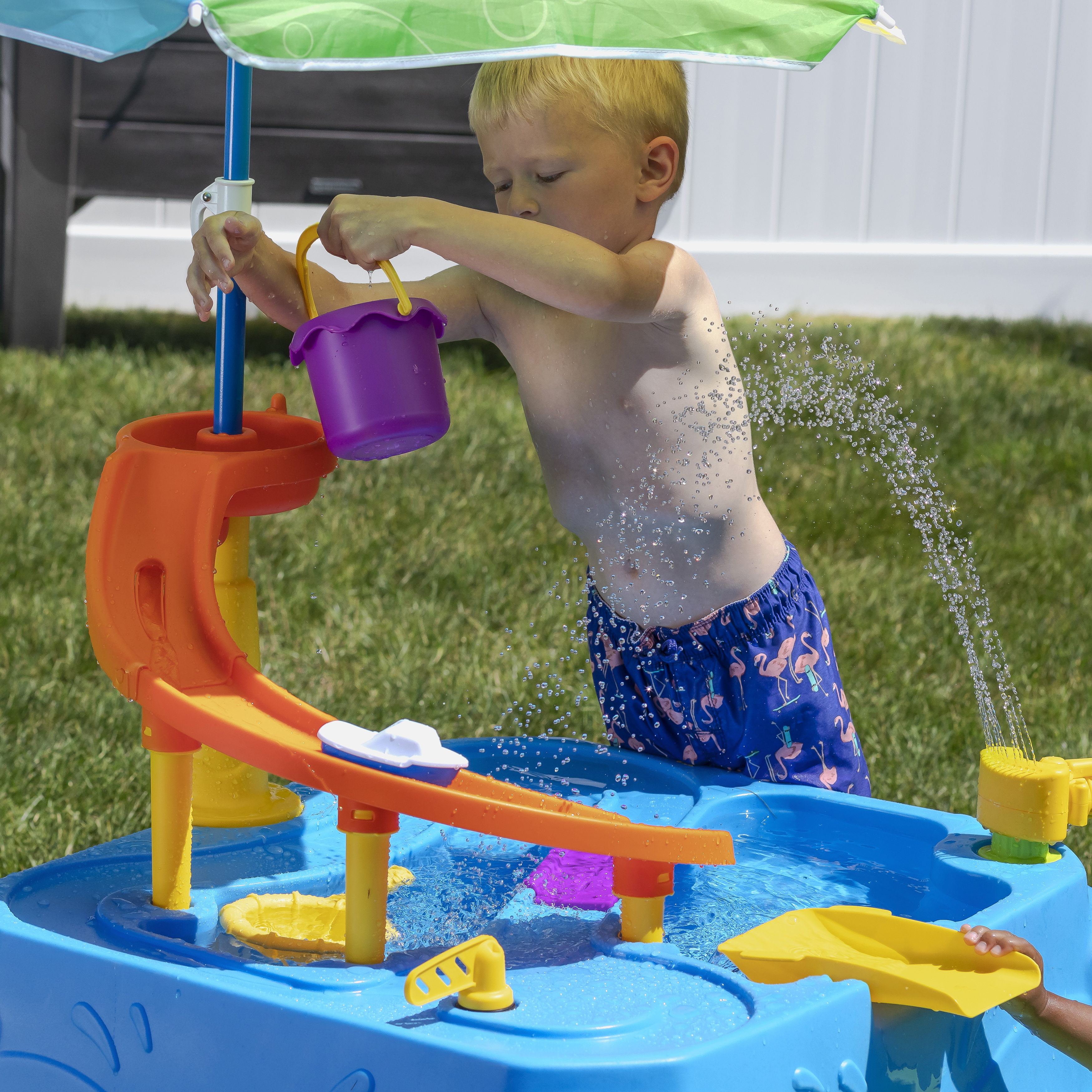 - Inhoud: watertafel met twee niveaus, zeef, emmer, beker, drie bootjes met wielen, sproeierhulpstuk en parasol.