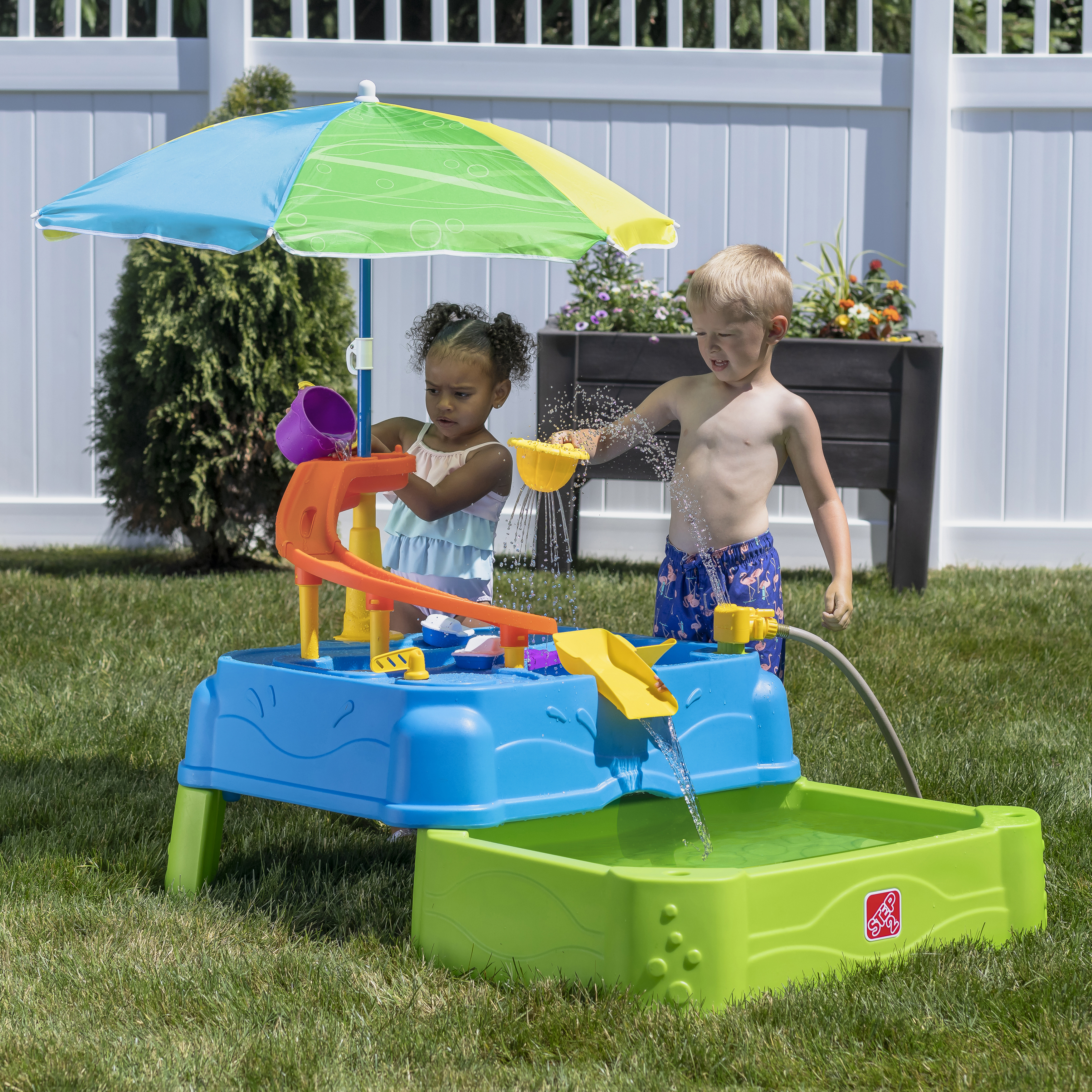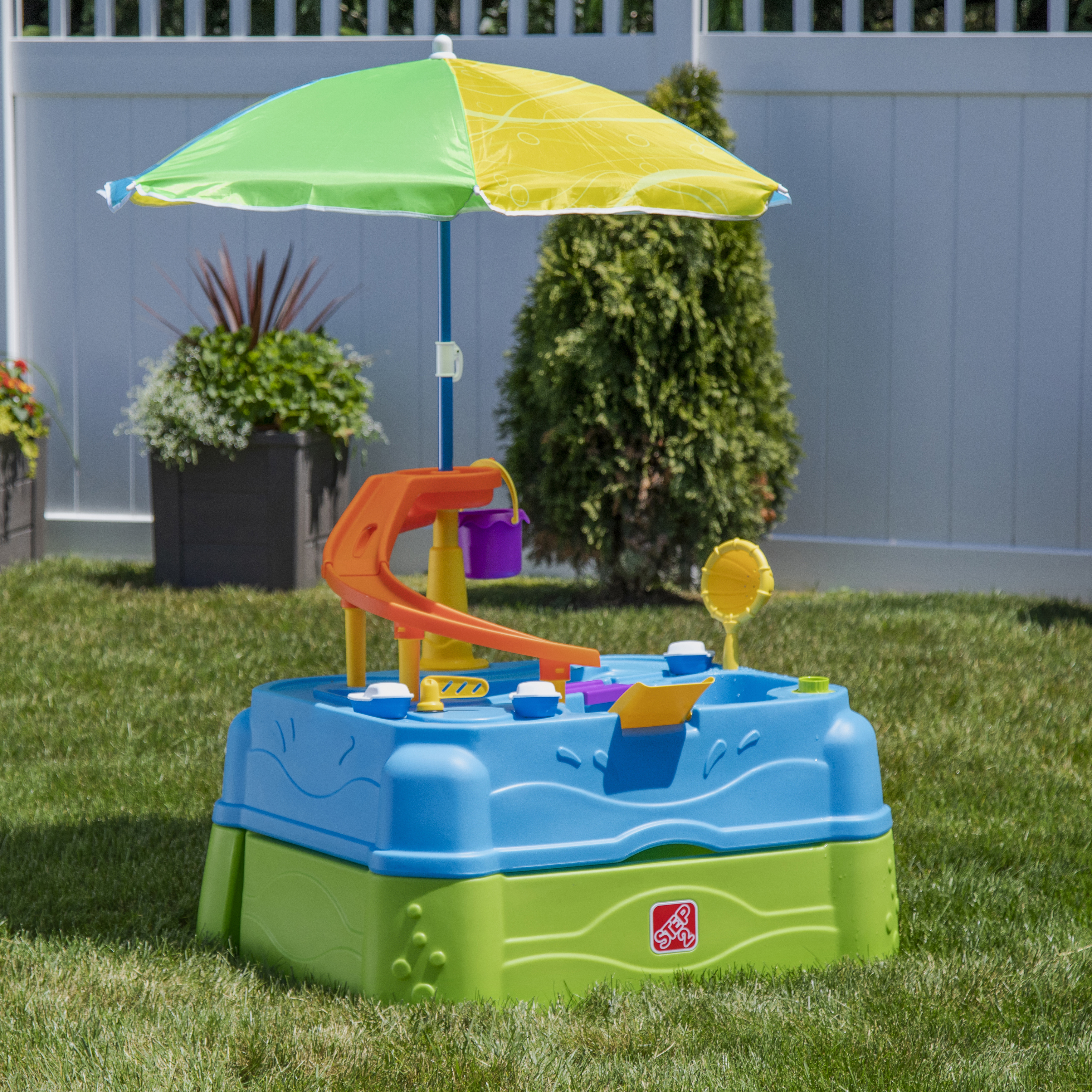 Speel, spetter en plons met de watertafel Waterpark Wonders Two-Tier van Step2! Deze watertafel is een variant op onze traditionele watertafel en biedt eindeloos speel- en spetterplezier. Je kindje kan in de schaduw van de parasol de hele dag plonsen en spannende wateractiviteiten ondernemen! Breng het bootspeelgoed van zee naar land met de ingebouwde wielen en gebruik de echt werkende ophaalbrug om matrozen en automobilisten door te laten. Sluit een gewone tuinslang aan op de watertafel-sproeier om het te laten regenen! En creëer een waterglijbaan door water uit de lagune van het waterpark op de torenhoge glijbaan te gieten en zie het water helemaal naar beneden stromen in het onderste bassin. Kindjes kunnen hun tenen in het grote bassin beneden laten zakken en op beide niveaus spetteren met de meegeleverde accessoires. Als het speelkwartier voorbij is, is het schoonmaken een fluitje van een cent dankzij de lekvrije aftappluggen in het bovenste en onderste niveau! Schuif de onderste bak weer onder de grote watertafel om hem compact op te bergen.