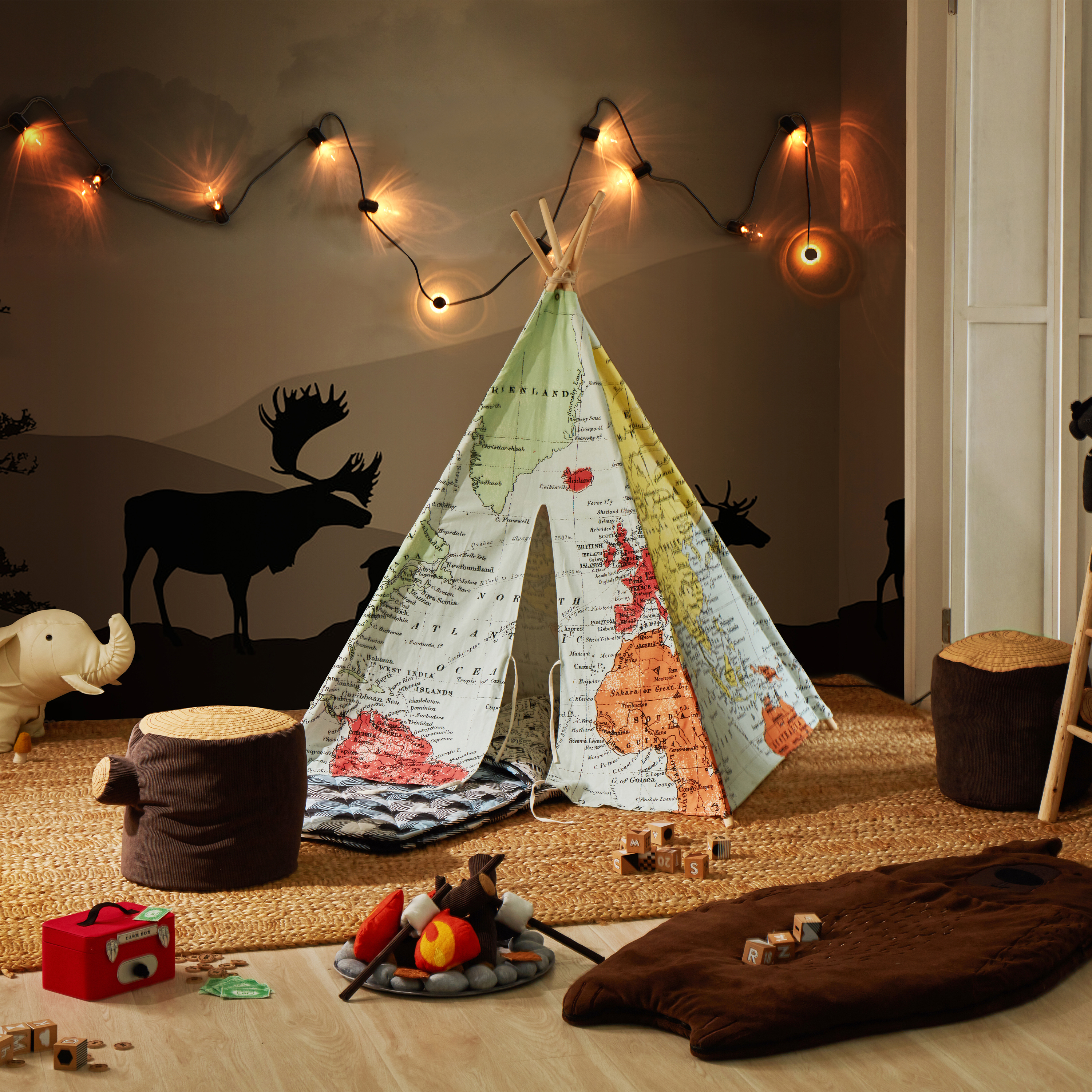 Met de Sunny Wereldkaart Tipi Tent Multikleur zullen kinderen een avontuur beleven. Waar ben je allemaal geweest? Ontdek de wereld en vertel verhalen die ze in hun dagelijks leven mee kunnen nemen. De kleuren en print zijn ideaal voor alle soorten kamers of voor het buiten spelen. Is dat niet perfect voor je kinderen? Als jullie zijn uitgespeeld vouw je de palen gemakkelijk bij elkaar, zodat je de Tipi kan meenemen of opbergen.