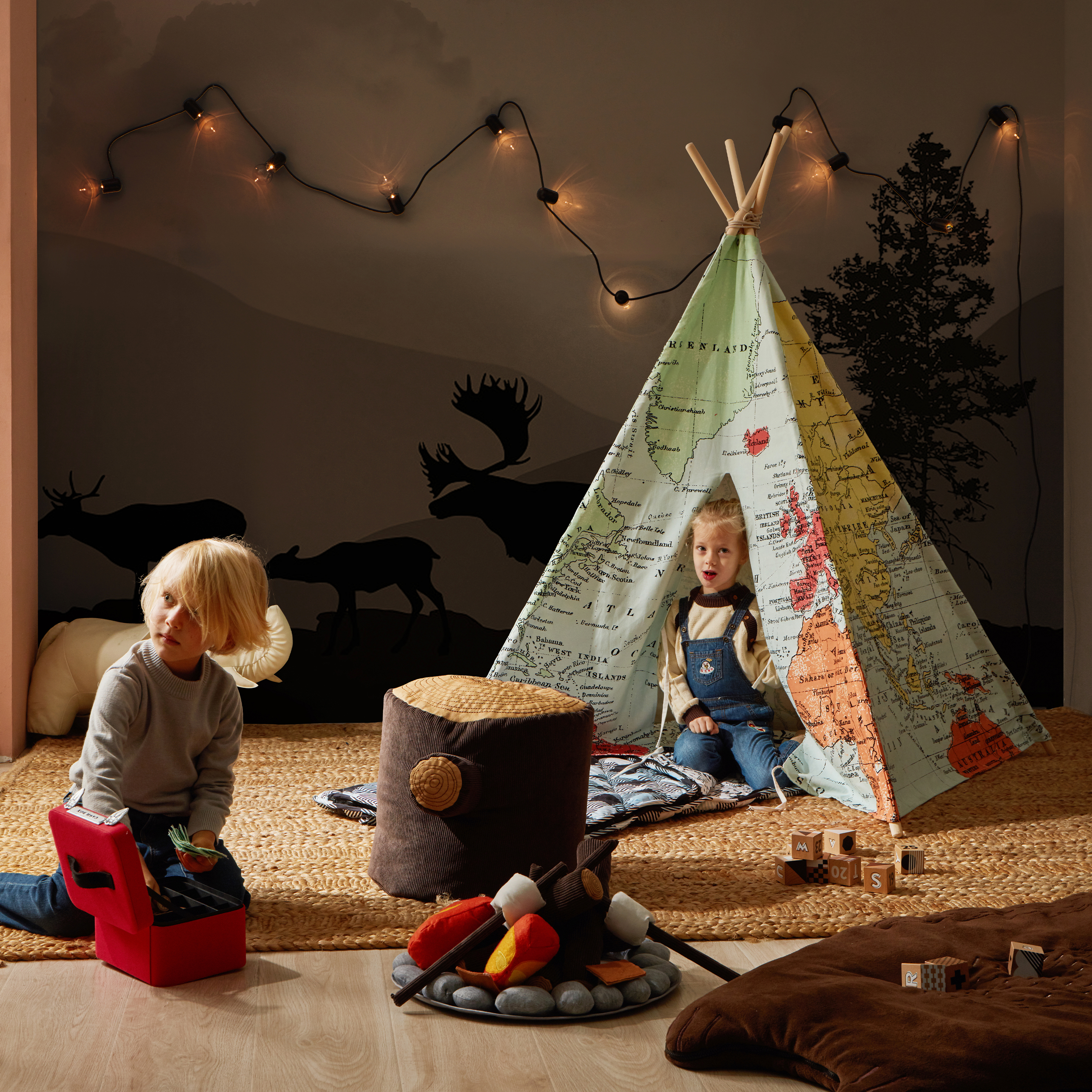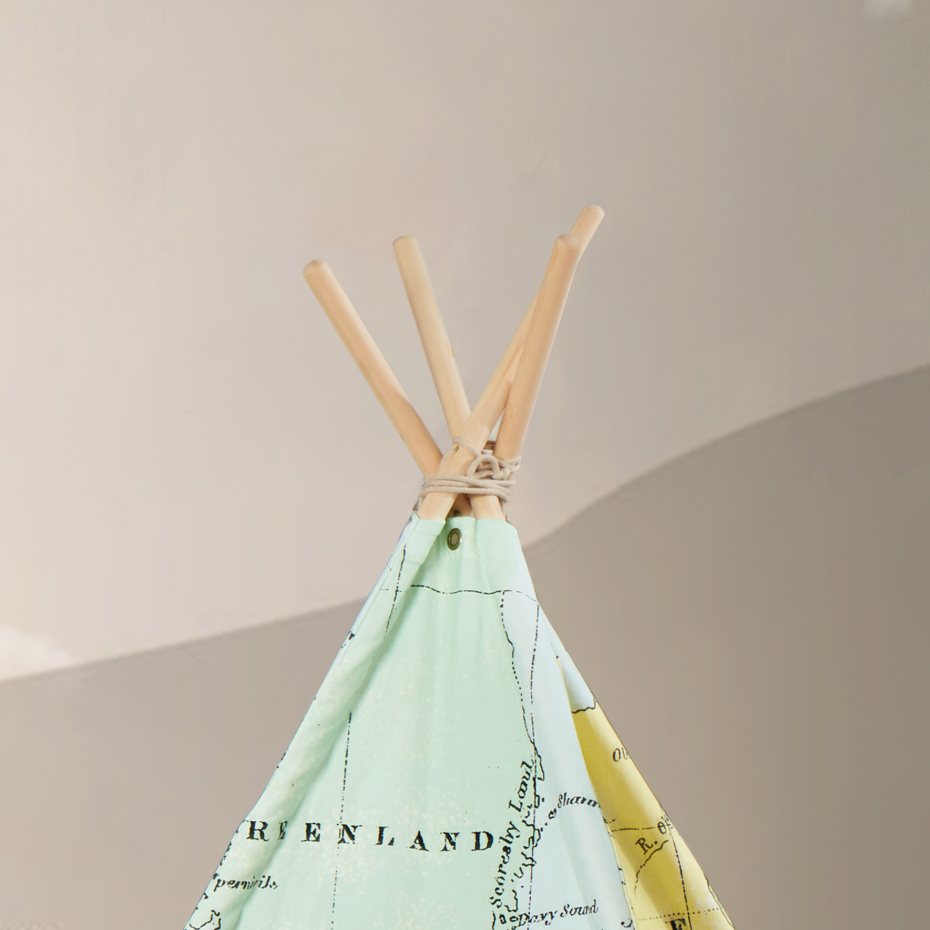 De Wereldkaart Tipi Tent is gemaakt van het beste materiaal. Zo hoeven jij en je kinderen zich alleen nog maar bezig te houden met spelen en avonturen beleven. De Tent bestaat uit een 100% natuurlijk, extra veilig, ademend katoenen canvas met een stevige constructie. De Tipi is eenvoudig te monteren door de 2-delige FSC 100% houten palen (Ø 2,4 cm) aan elkaar te maken doormiddel van een kunststof tussenstuk. Plaats de palen in de openingen van de katoenen canvas en bind de palen aan de bovenkant bij elkaar met het meegeleverde koord.